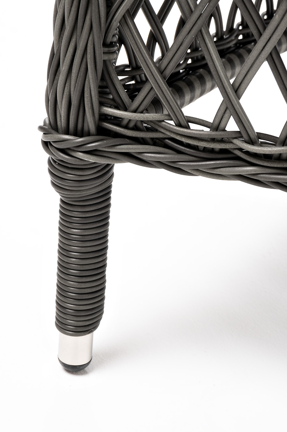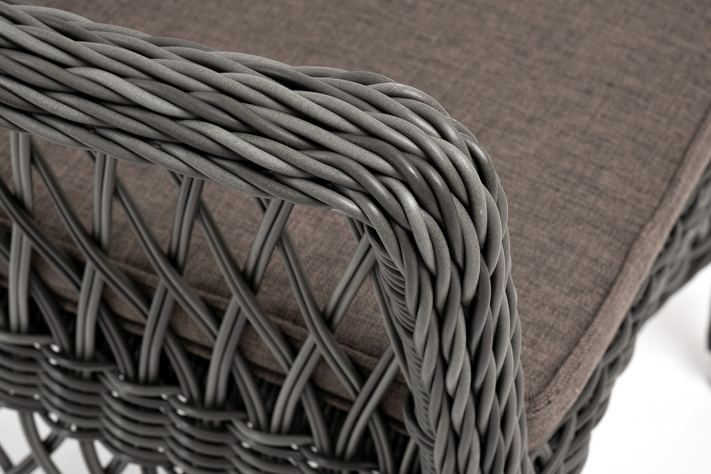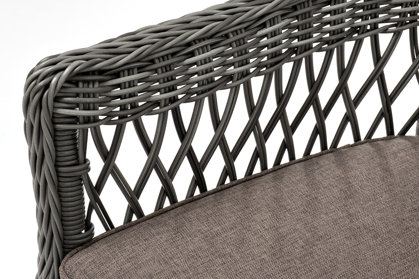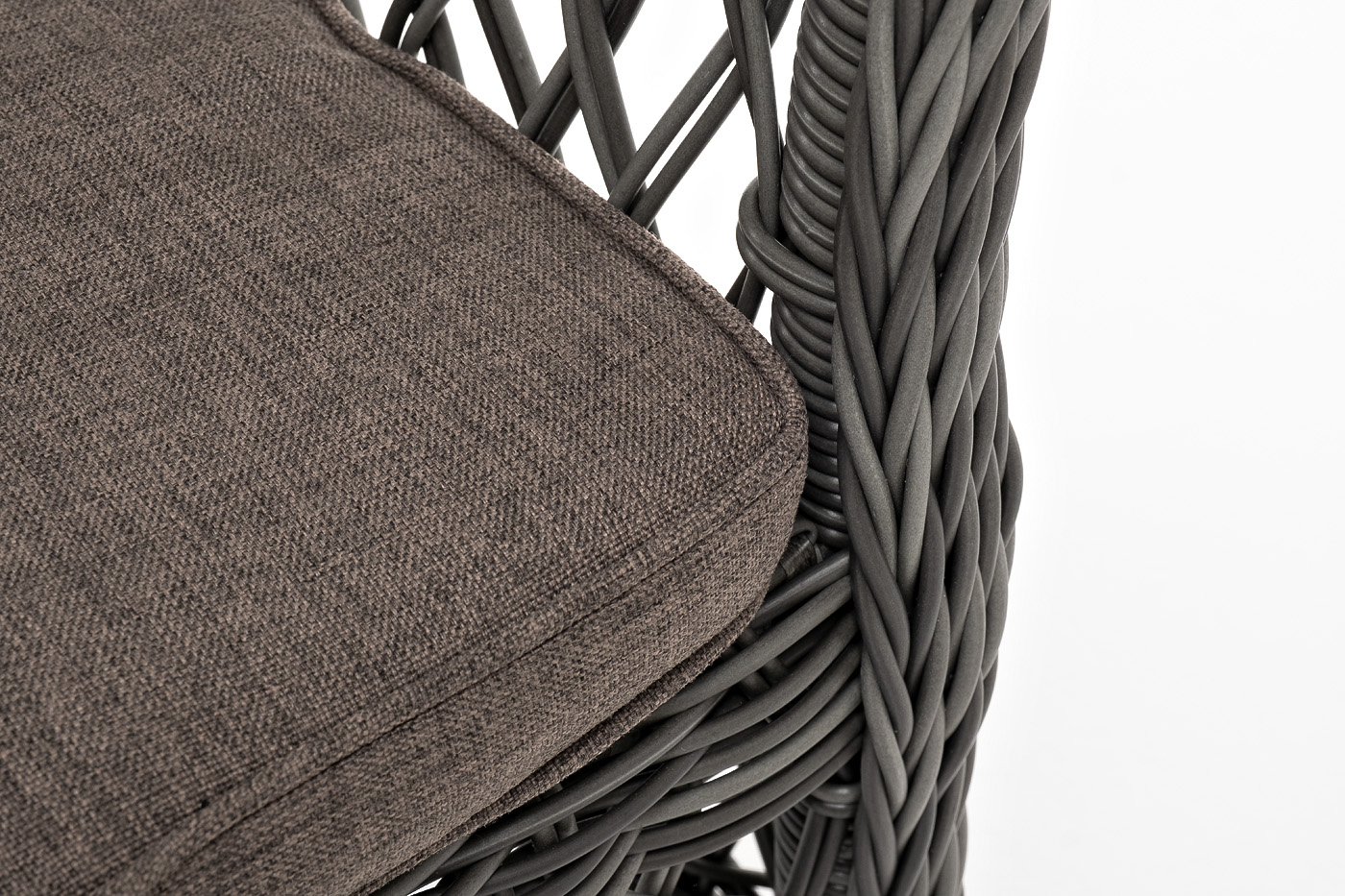 Стул оплетен вручную круглым искусственным ротангом графитового оттенка. В комплекте представлена мягкая подушка-сиденье серого цвета. Подушка имеет съёмный чехол из полиэстера (100%), плотностью 300гр/м2, с влагоотталкивающей пропиткой.