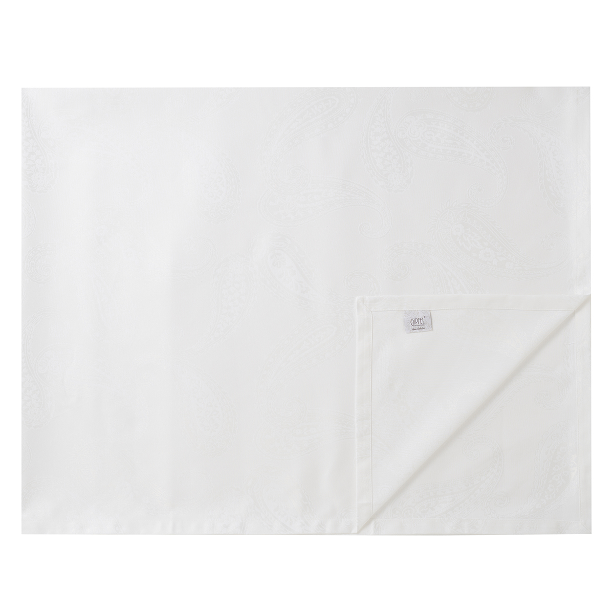 Скатерть выполнена в благородном белом цвете с узором пейсли и с атласным блеском. Подойдет как для повседневной сервировки, так и для банкетного стола. Скатерть на столе всегда добавляет уют и торжественность даже обычному буднему ужину.