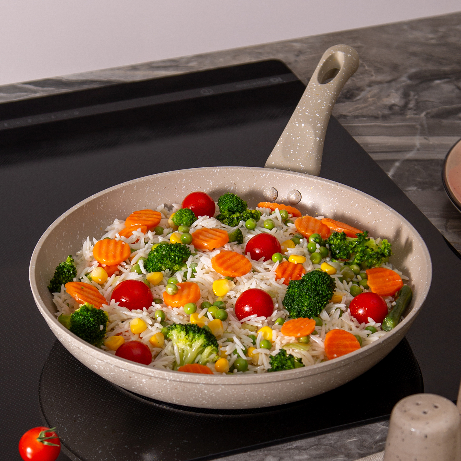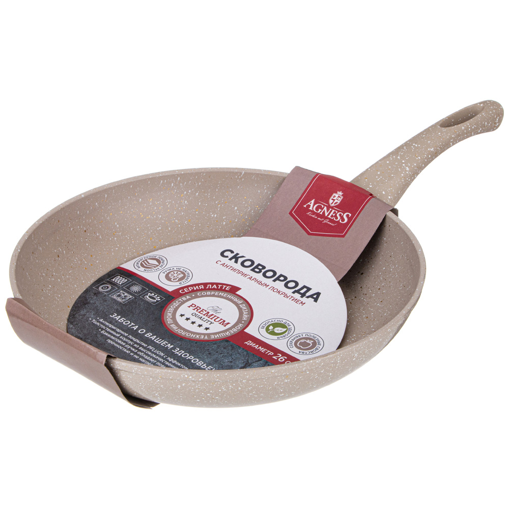 СКОВОРОДА AGNESS С АНТИПРИГАРНЫМ ПОКРЫТИЕМ "LATTE" - это идеальный выбор для тех, кто ценит удобство и функциональность в посуде. Одним из главных достоинств этой сковороды является ее антипригарное покрытие, которое позволяет готовить без использования большого количества масла, а также обеспечивает равномерное распределение тепла. Благодаря этому, продукты готовятся быстрее и сохраняют свои полезные свойства.Быстрое нагревание сокращает время приготовления и сохраняет вкус и аромат продуктов. Многослойная структура покрытия обеспечивает превосходные эксплуатационные качества и увеличивает срок службы, не содержит PFOA.Эргономичная ручка из бакелита с мягким покрытием SOFT TOUCH не нагревается и не плавится, обеспечивает безопасное использование сковородки в процессе приготовления пищи. Посуда AGNESS - это современный дизайн и новейшие технологии производства.