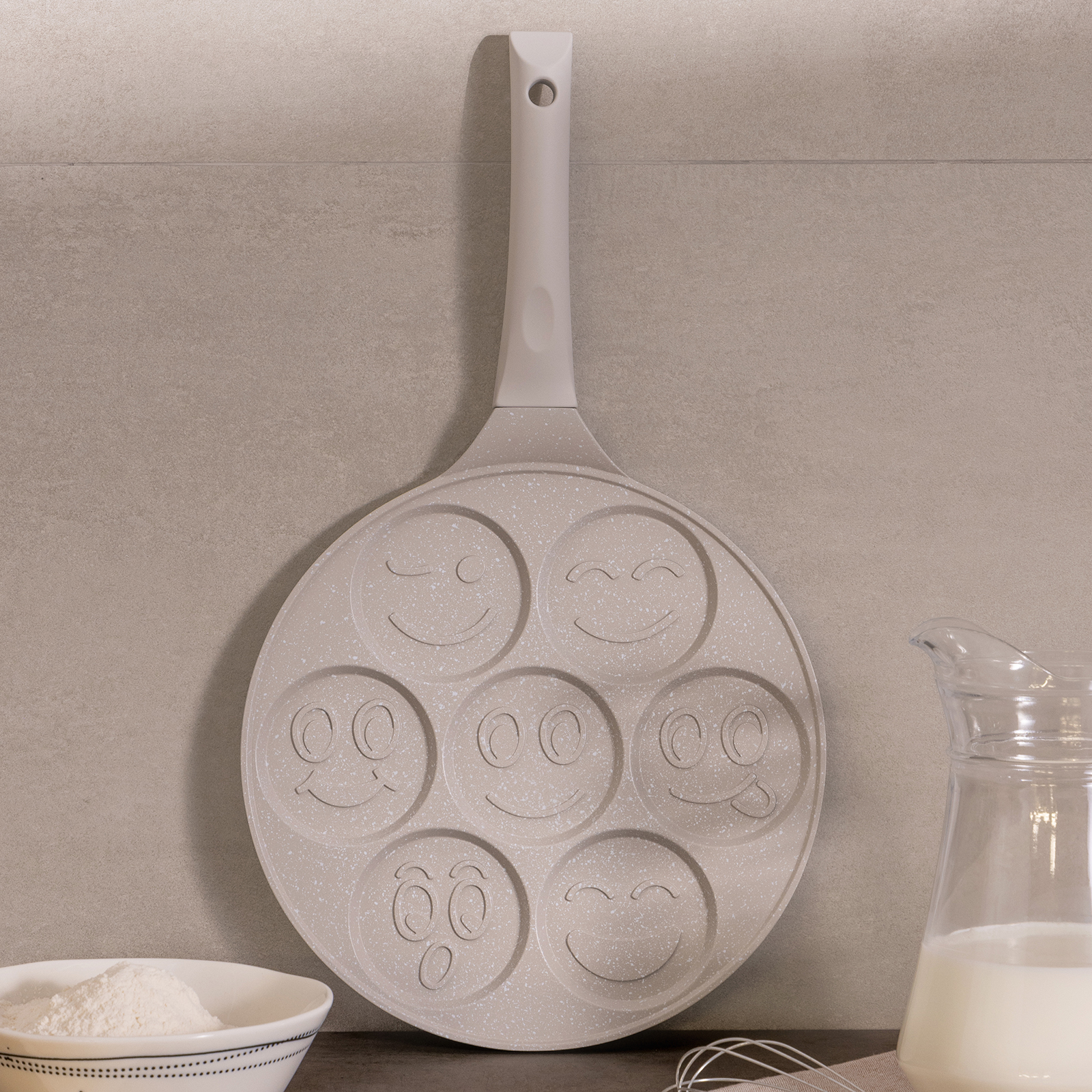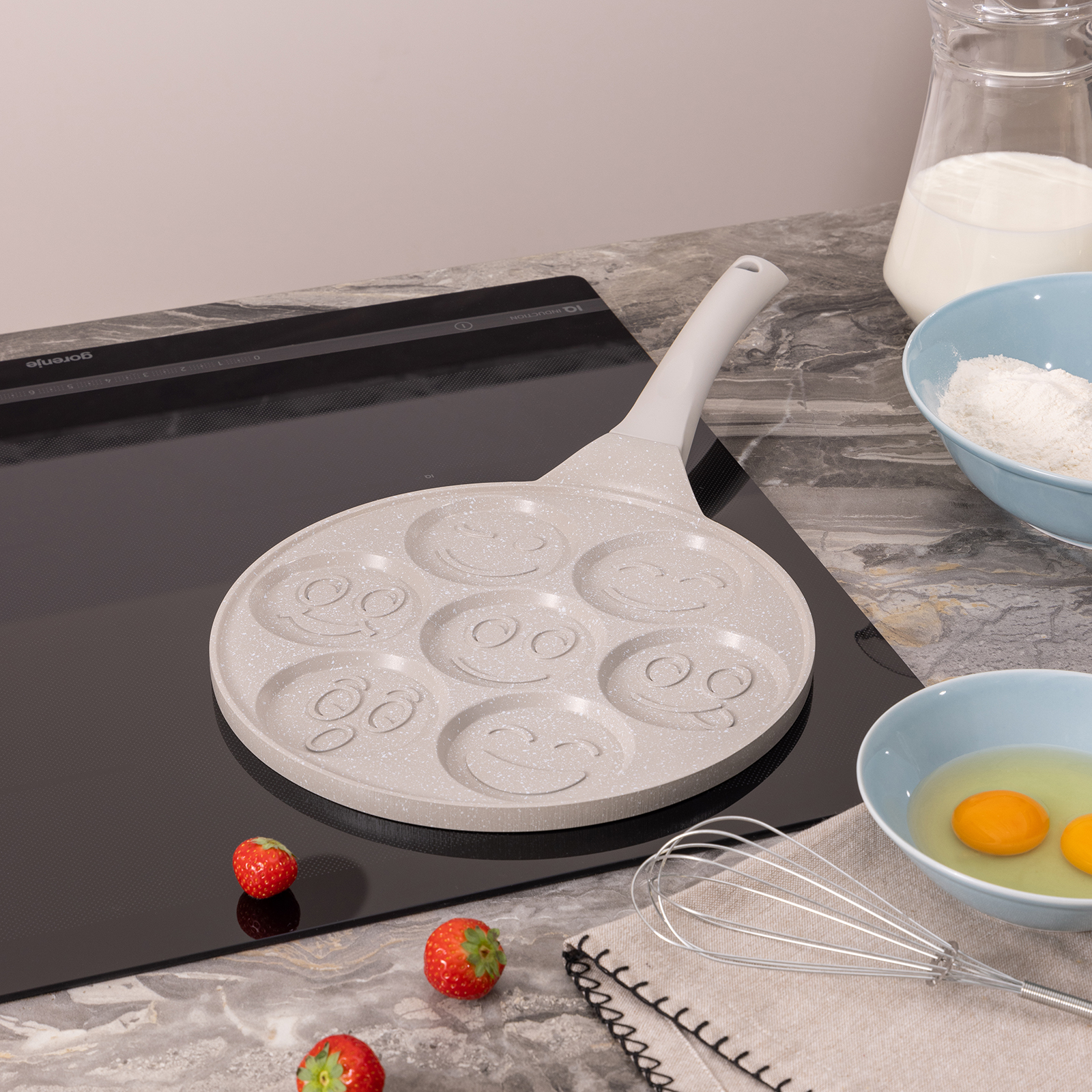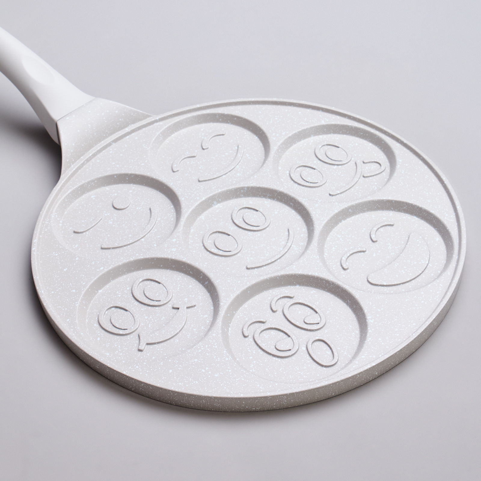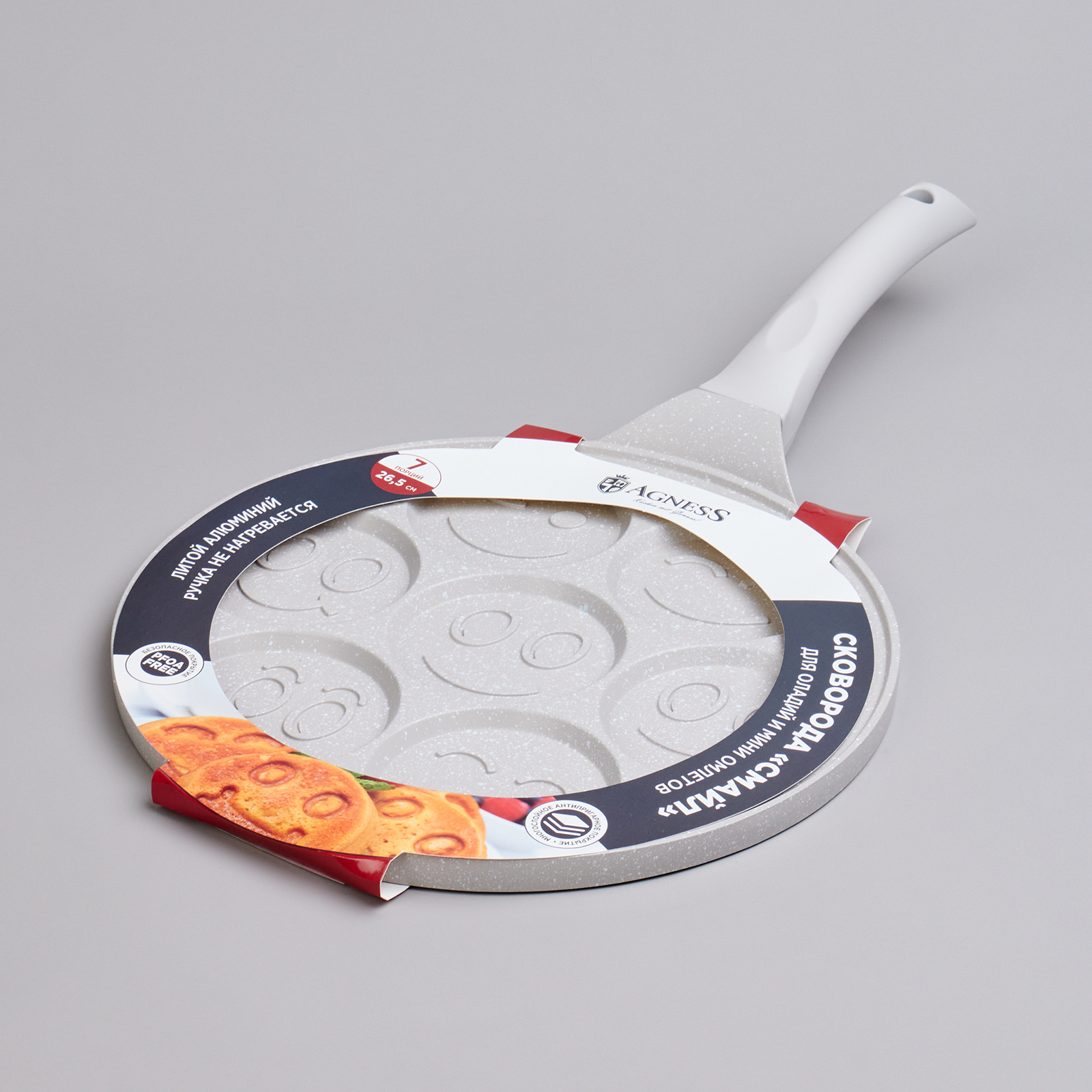 Сковороды AGNESS серии "СМАЙЛ" выполнены из литого алюминия. Такая посуда отличается высокой теплопроводностью и устойчивостью к деформациям. Необычный дизайн сковороды позволит приготовить интересные и веселые оладушки и омлеты.
