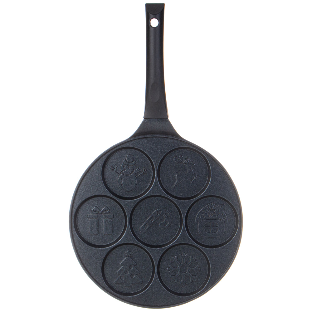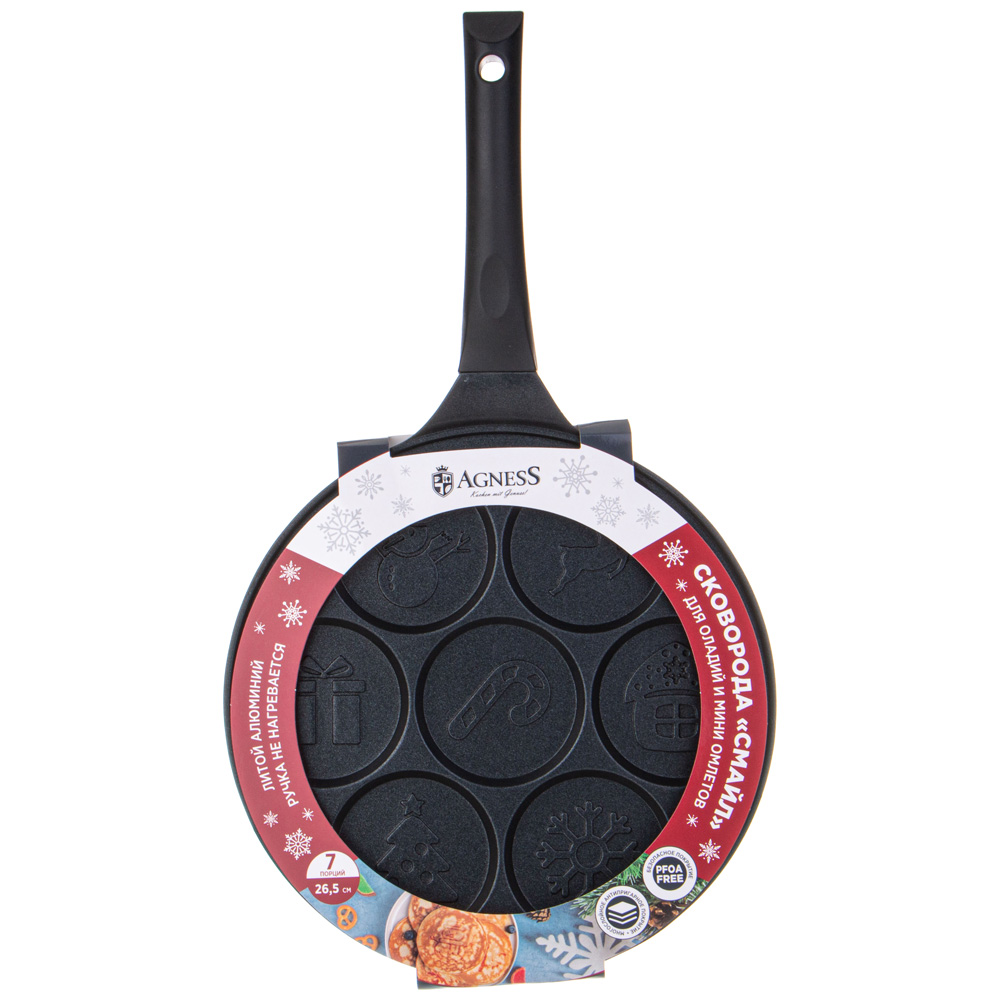 Сковороды AGNESS серии "Зимняя забава" выполнены из литого алюминия. Такая посуда отличается высокой теплопроводностью и устойчивостью к деформациям. Необычный дизайн сковороды позволит приготовить интересные и веселые оладушки и омлеты.