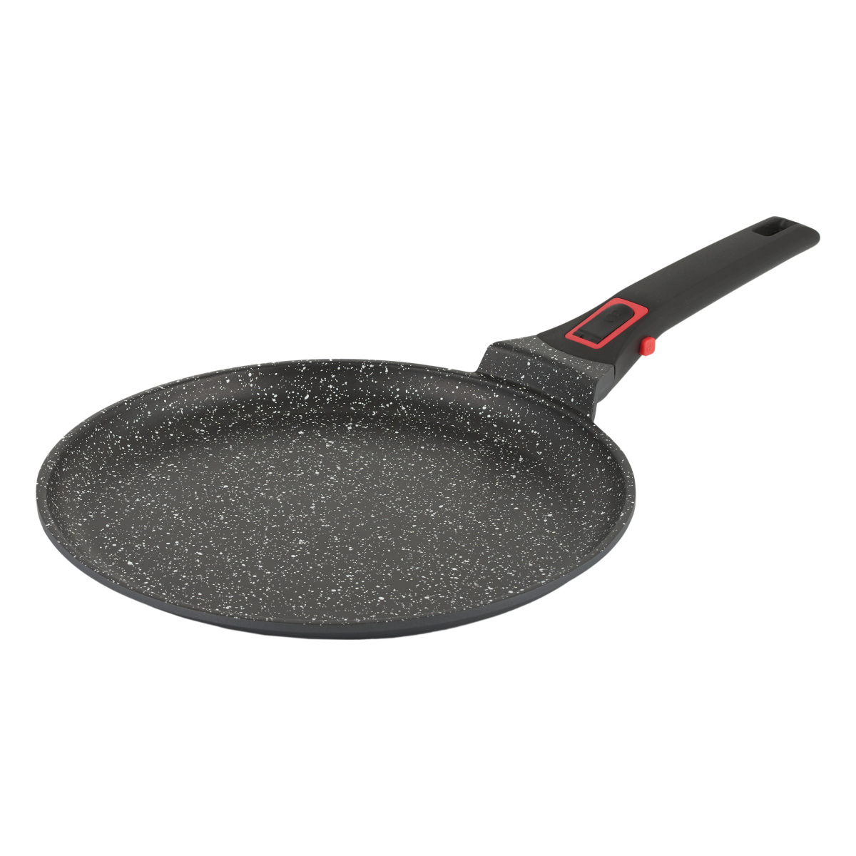 Сковорода сделана из литого алюминия, диаметр 28 см, у модели невысокие стенки – 2,5 см, что делает модель удобной для переворачивания блинов и оладьев. У сковороды толстый корпус – 2 мм толщина стенок, 4,5 мм – толщина дна.