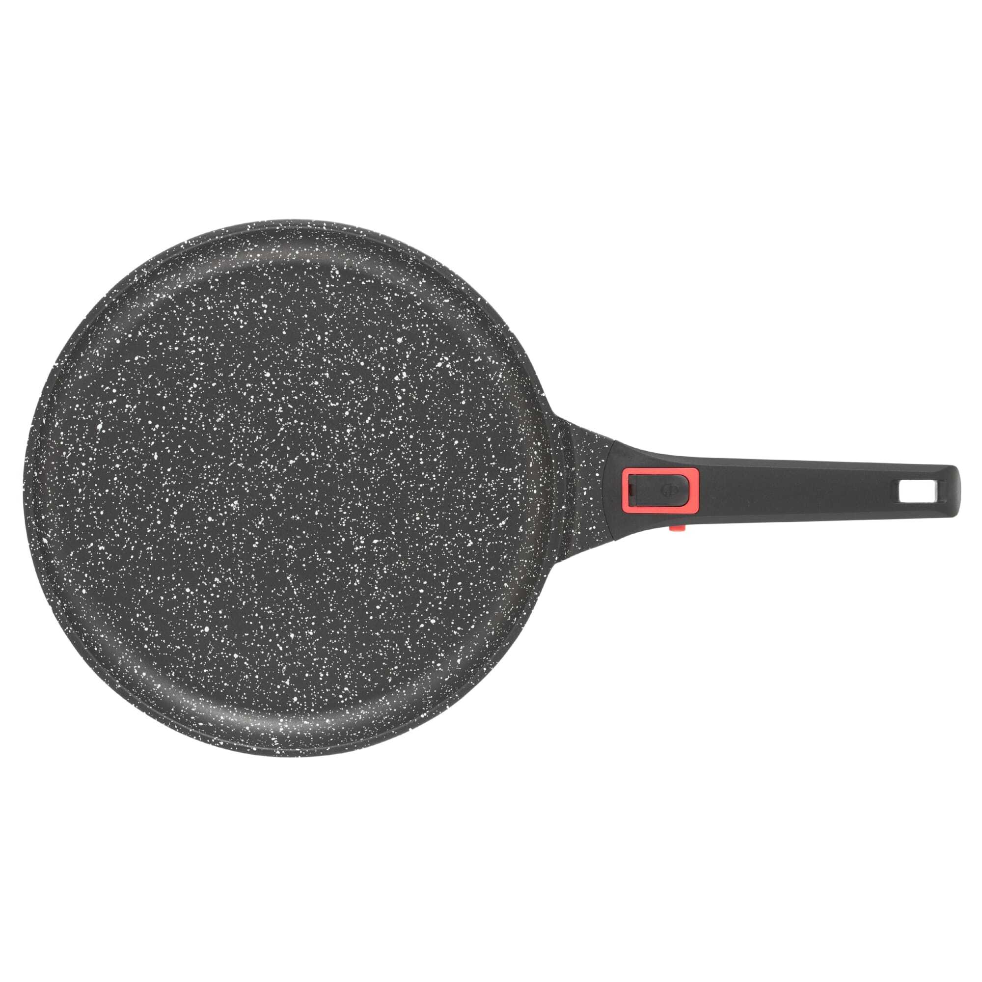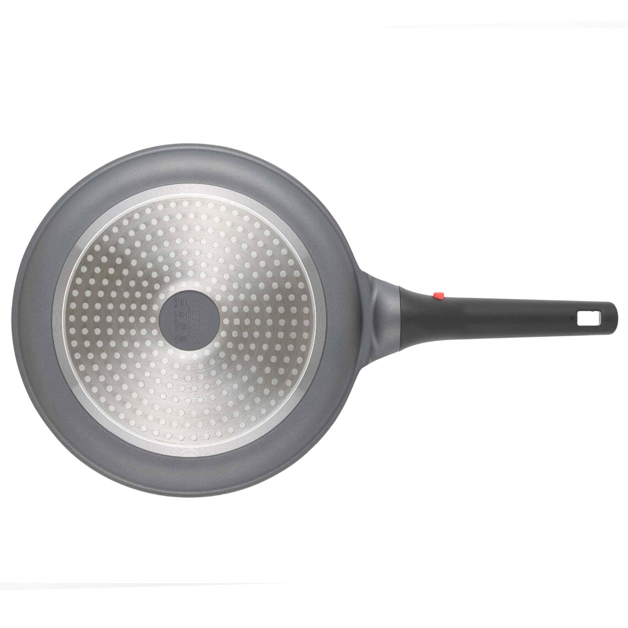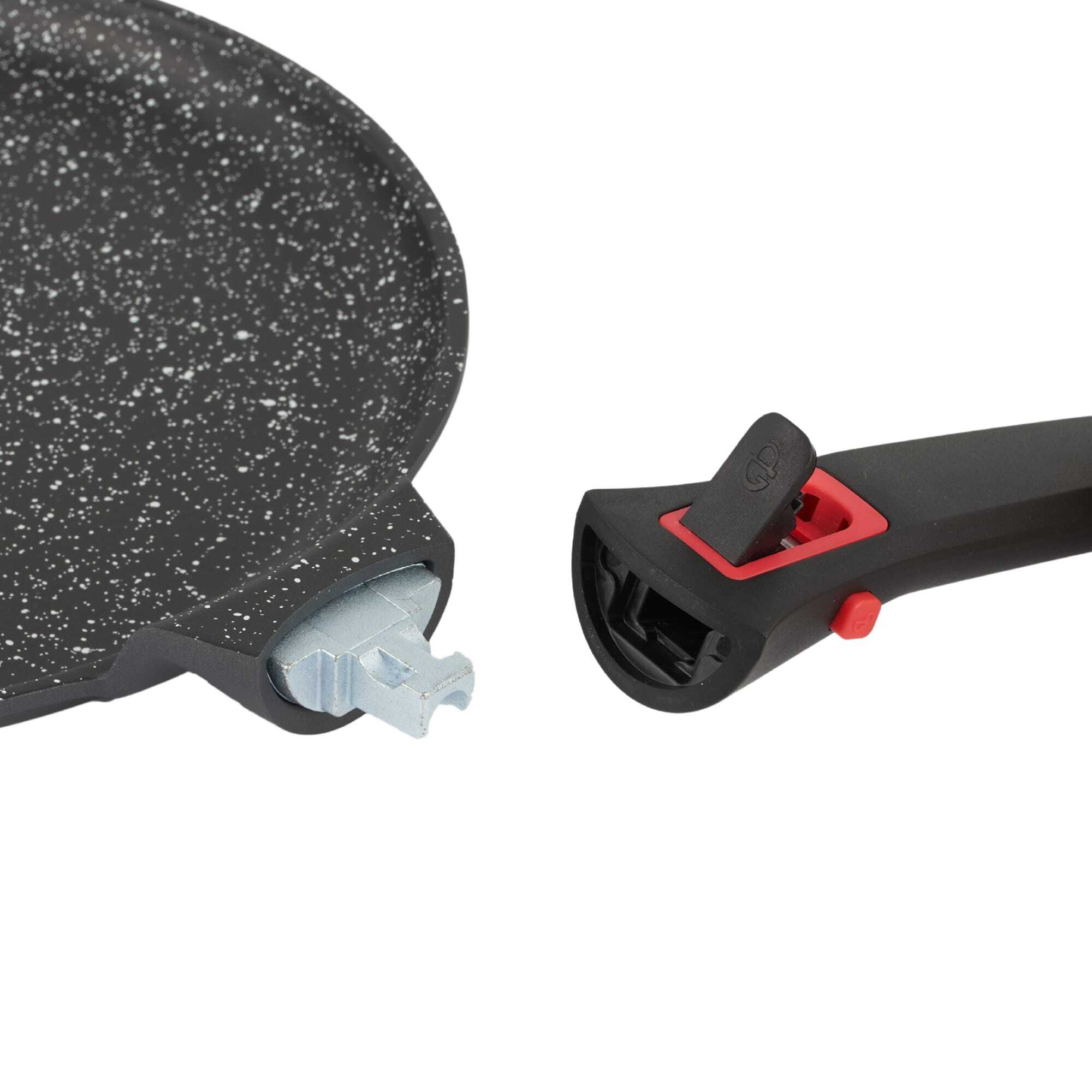 Трехслойное антипригарное мраморное покрытие Pfluon Marble исключает пригорание при жарке и тушении, а съемная ручка позволяет использовать сковороду в духовке в качестве формы для запекания для пиццы, а также значительно экономит место при хранении.