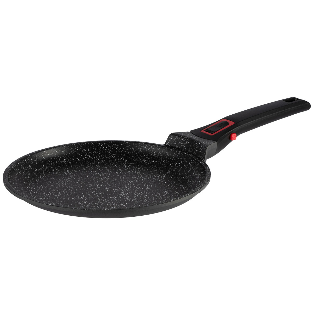 Сковорода сделана из литого алюминия, диаметр 24 см, у модели невысокие стенки – 2,1 см, что делает ее удобной для переворачивания блинов. У сковороды толстый корпус – 2 мм толщина стенок, 4,5 мм – толщина дна.