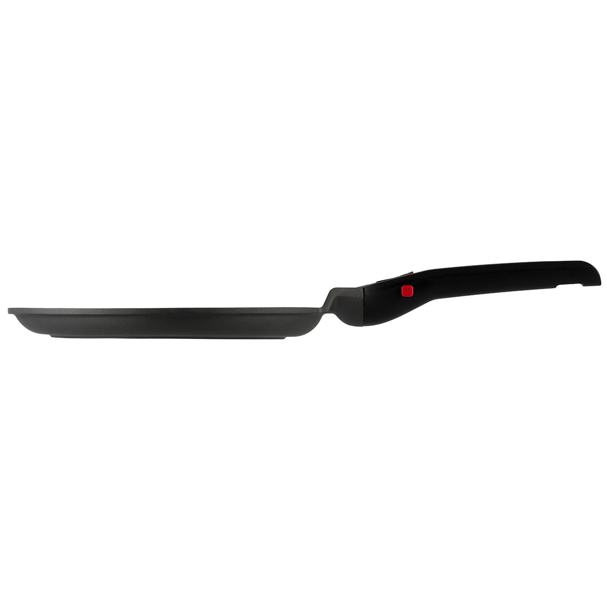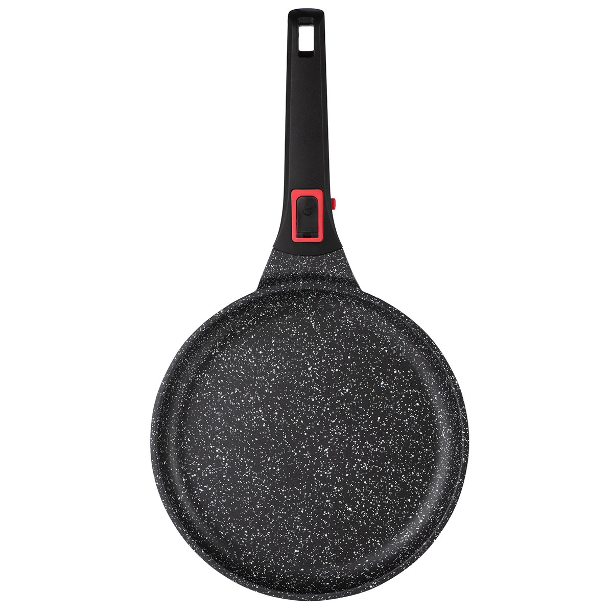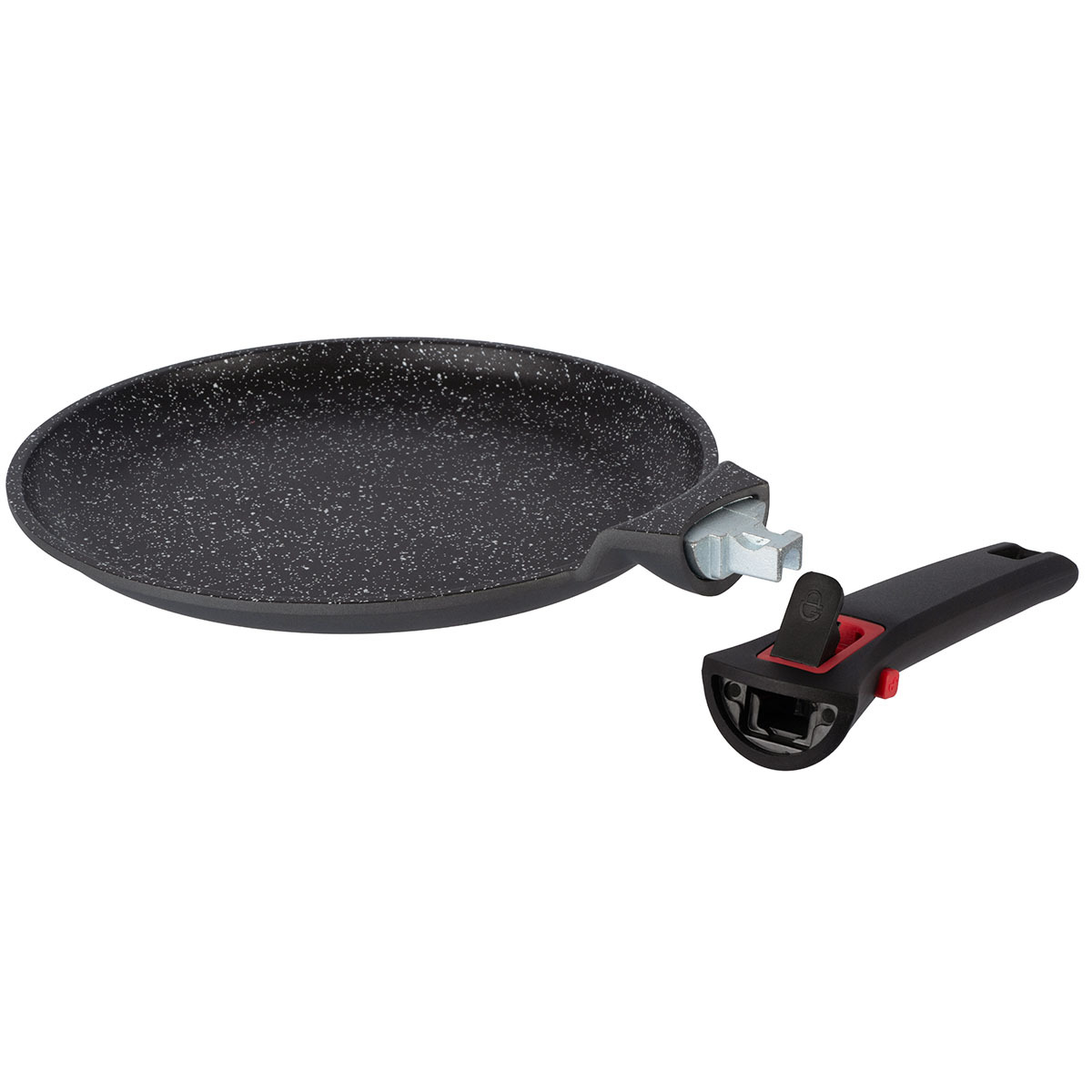 Трехслойное антипригарное мраморное покрытие Pfluon Marble исключает пригорание при жарке и тушении, а съемная ручка позволяет использовать сковороду в духовке в качестве формы для запекания пиццы, а также значительно экономит место при хранении.