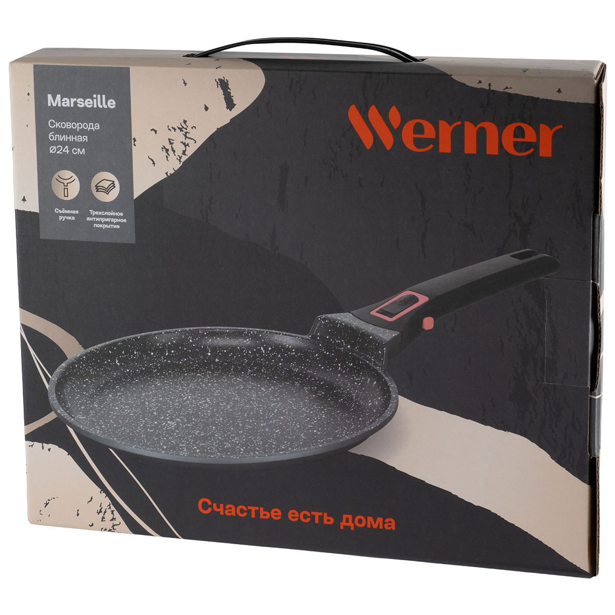 Сковорода блинная Werner Marseille 51998. Размер 24х2,1 см. Сделана из литого алюминия с трехслойным антипригарным мраморным покрытием Pfluon Marble. Оснащена съемной бакелитовой ручкой. Толщина дна 4,5 мм, толщина стенок: 2 мм.