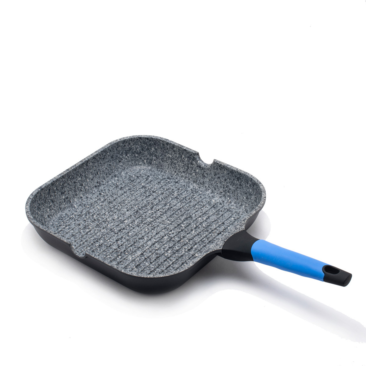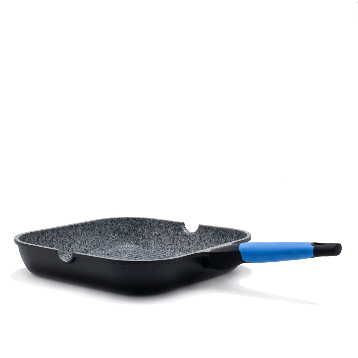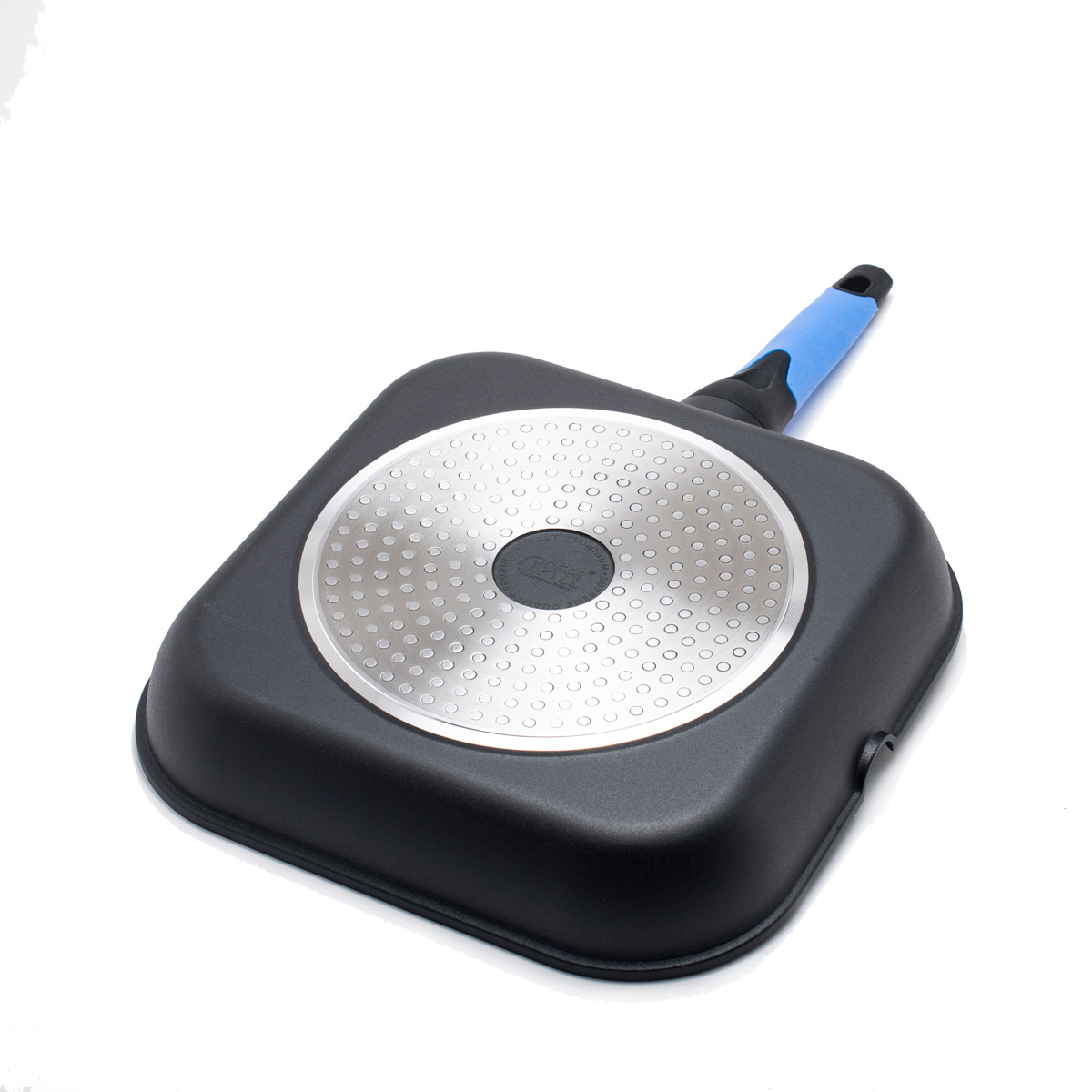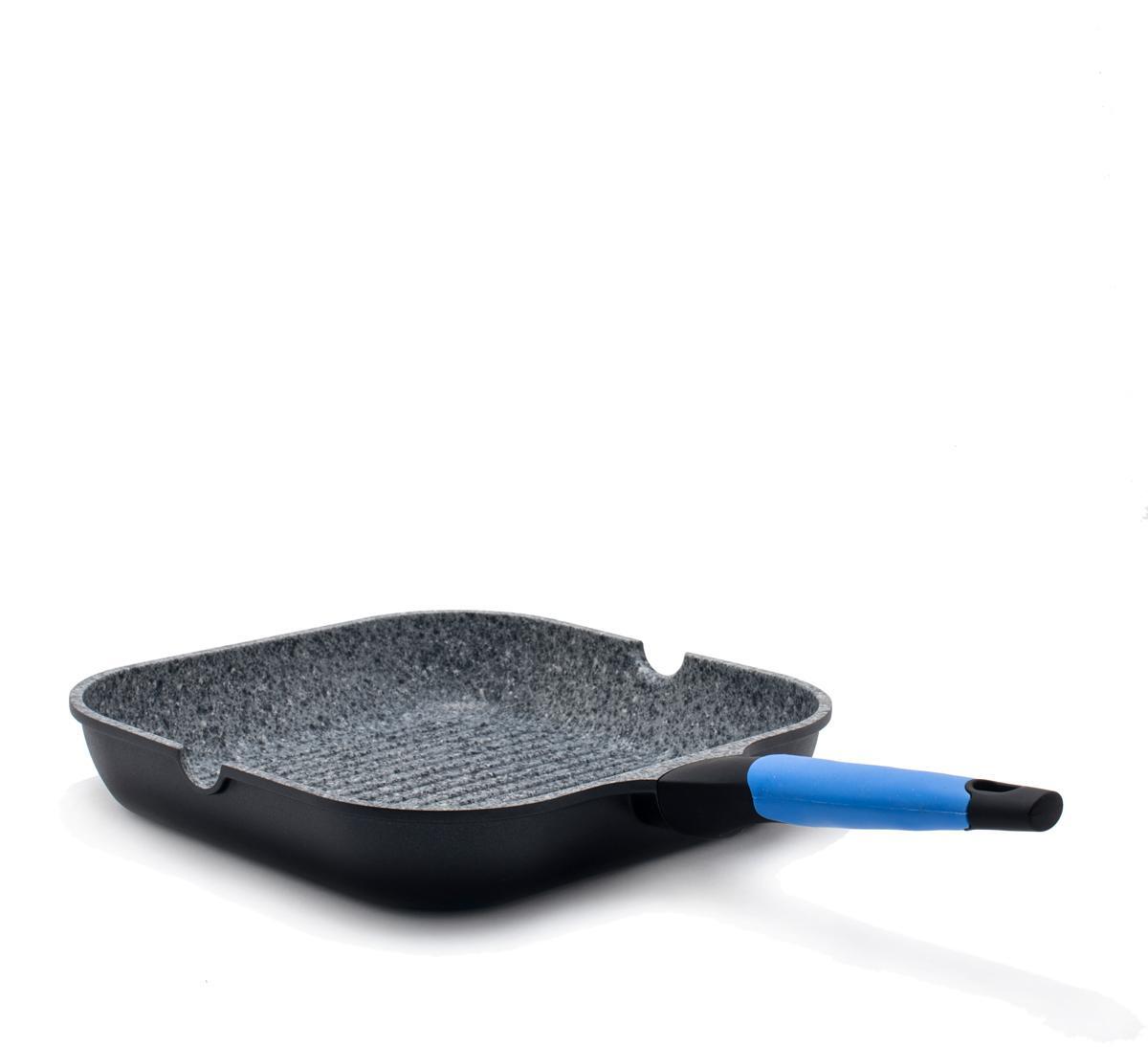 Вся посуда из серии SANDRA изготовлена из литого алюминия. Технология литья позволяет избежать механического воздействия на алюминий, что гарантирует более долгий срок службы посуды. Внутренняя часть корпуса сковороды покрыта антипригарным покрытием PFLUON, а внешняя – покрытием PTFE. На голубую бакелитовую ручку нанесено покрытие SOFT TOUCH. Данная сковороды-гриль имеет квадратную форму, длина стороны составляет 28 см.