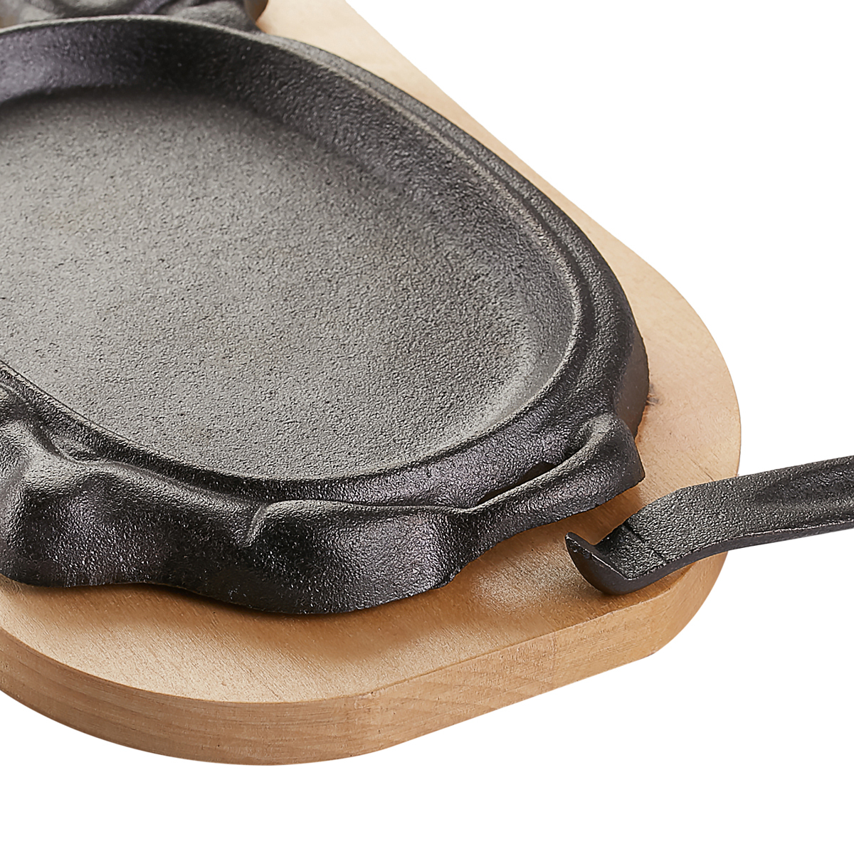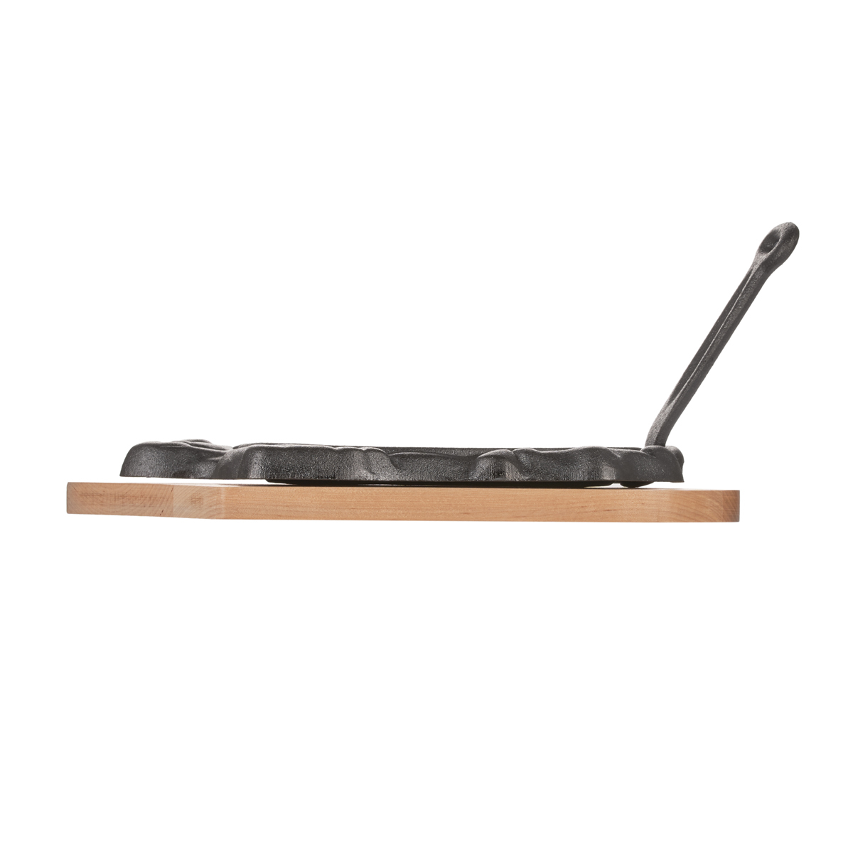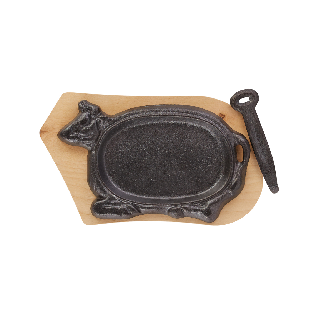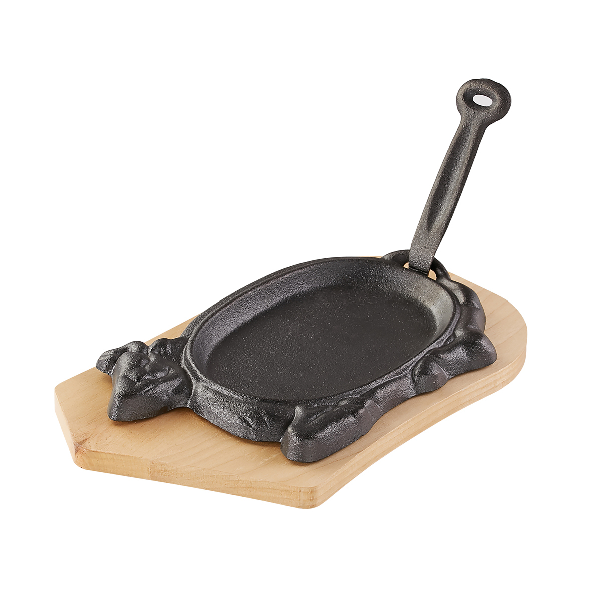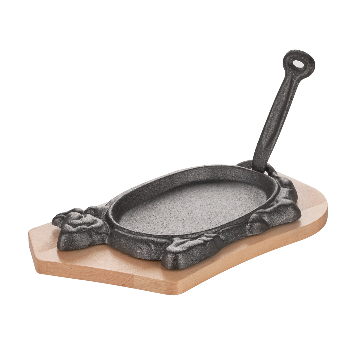 Чугунная сковорода, изготовленная в необычной форме, на деревянной подставке, идущей в комплекте. Сковорода предназначена как для готовки, так и для сервировки – поданное на ней блюдо гарантированно будет смотреться оригинальнее сервированного на обычной тарелке. Сковорода подходит для готовки на всех типах плит, включая индукционные, а также для использования в духовом шкафу.