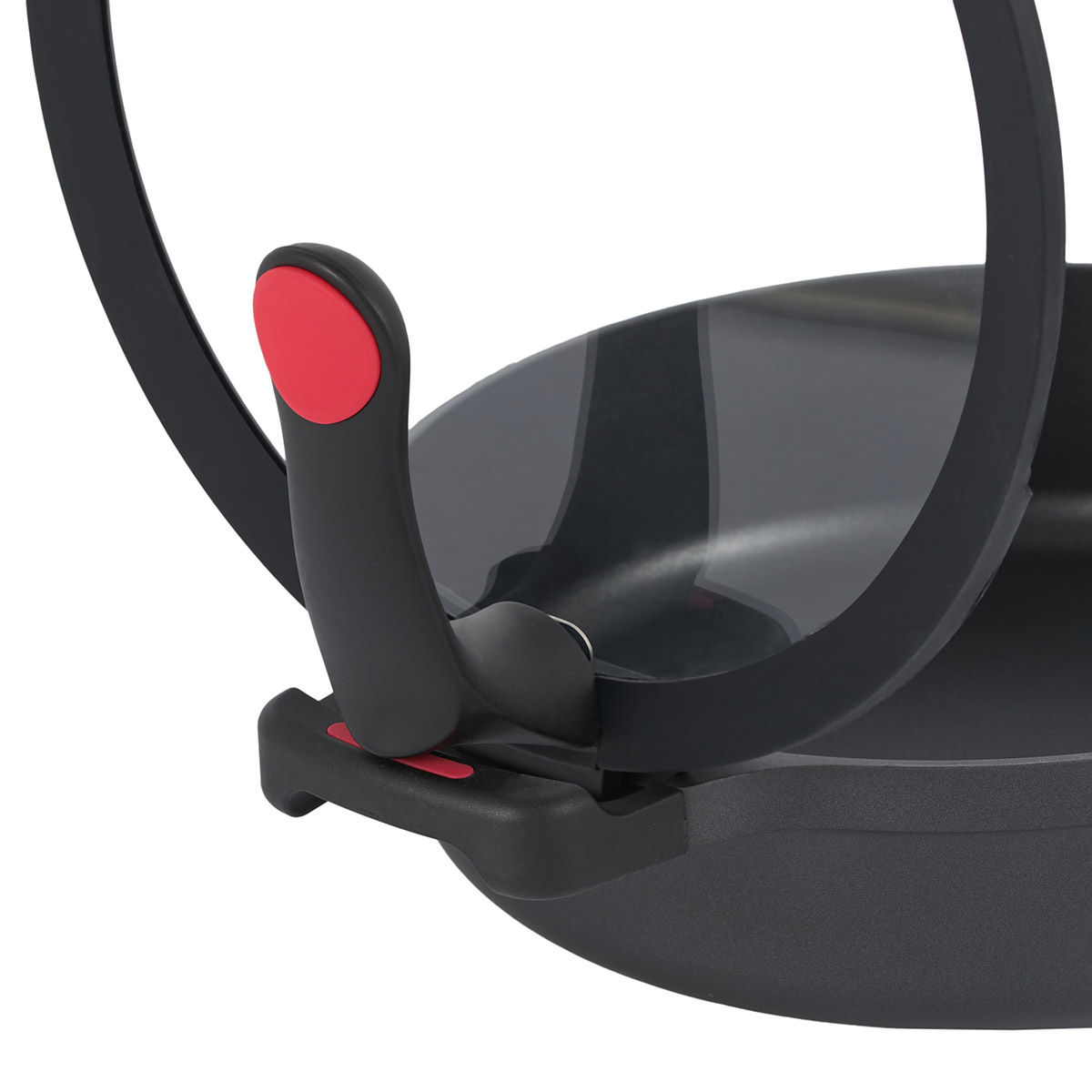У крышки силиконовый обод, что делает ее бесшумной при открывании и закрывании, а также отверстия для слива. На корпусе сковороды бакелитовый держатель для установки крышки в вертикальное положение.