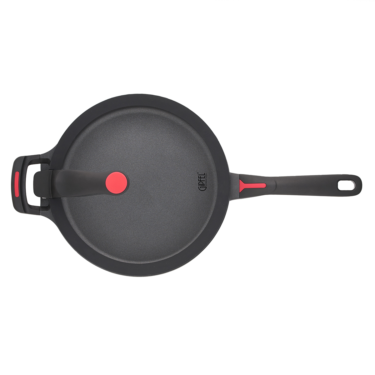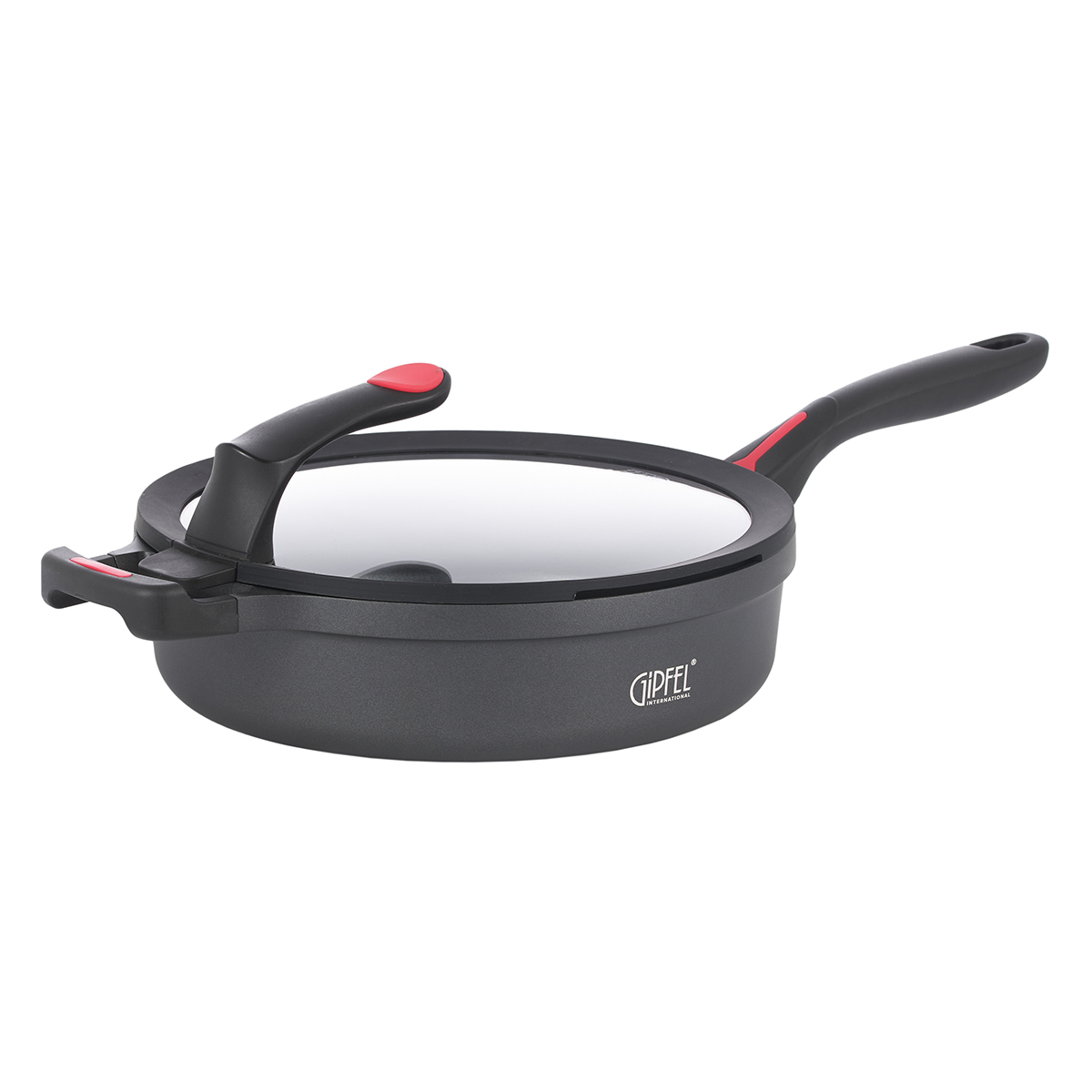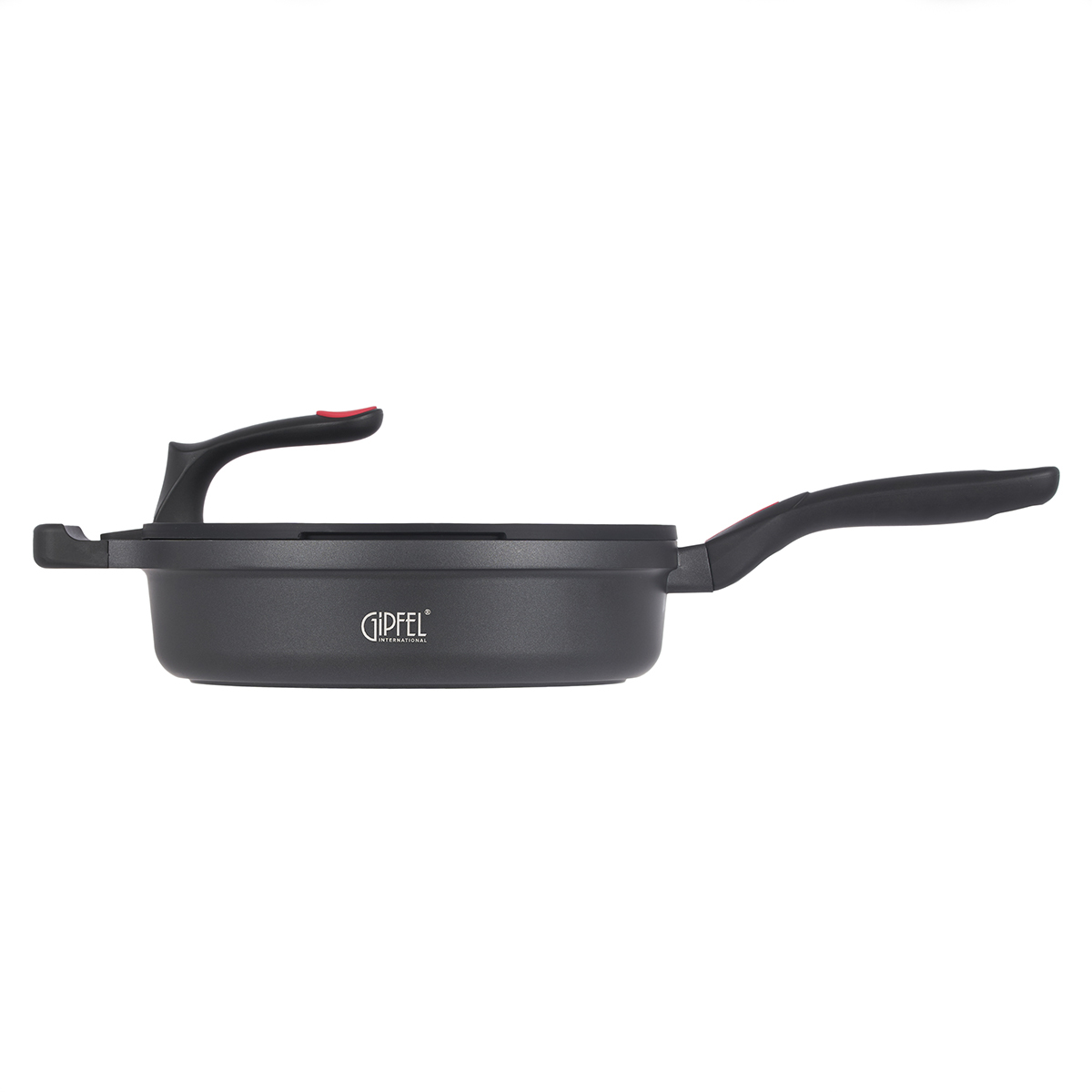 Сковорода-сотейник Gipfel Gourmet 52343 28 см/3,5 л с двухслойным антипригарным покрытием ILAG Essential, индукционным дном и стеклянной крышкой с силиконовым ободом и бакелитовым держателем для установки крышки в вертикальное положение. Толщина стенок 1.8 мм, толщина дна 5.5 мм. Материал: алюминий, стекло, бакелит, силикон.