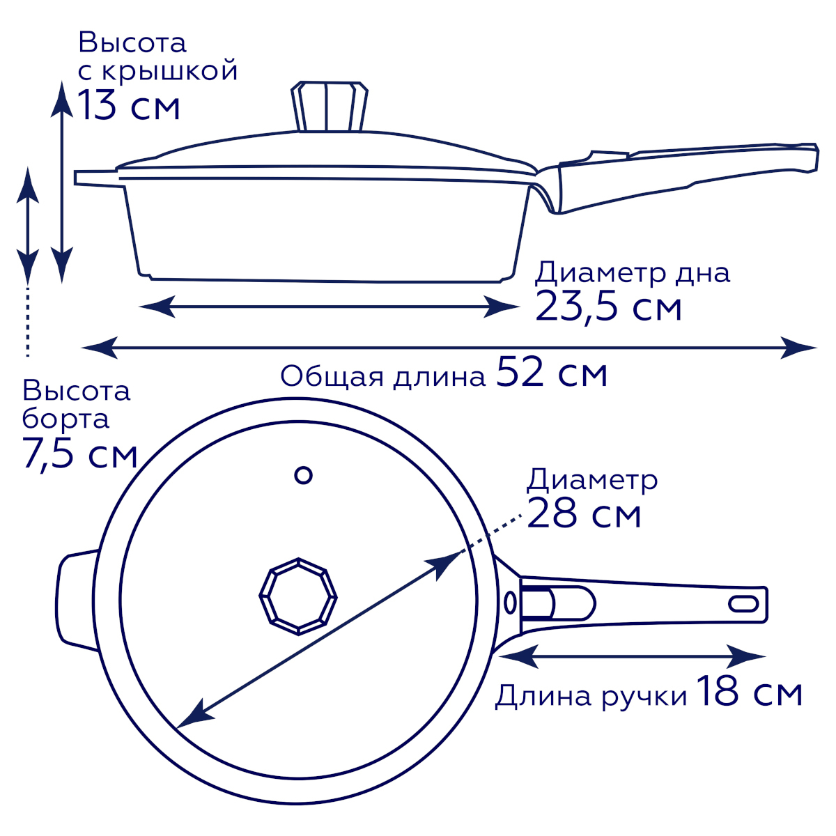 Сковорода-сотейник Gipfel Proofet 2446 размером 28x7.5 см, объемом 3,9 л изготовлена из литого алюминия, что позволяет ей равномерно нагреваться и распределять тепло. Толщина стенок 1,9 мм, толщина дна 4,5 мм.