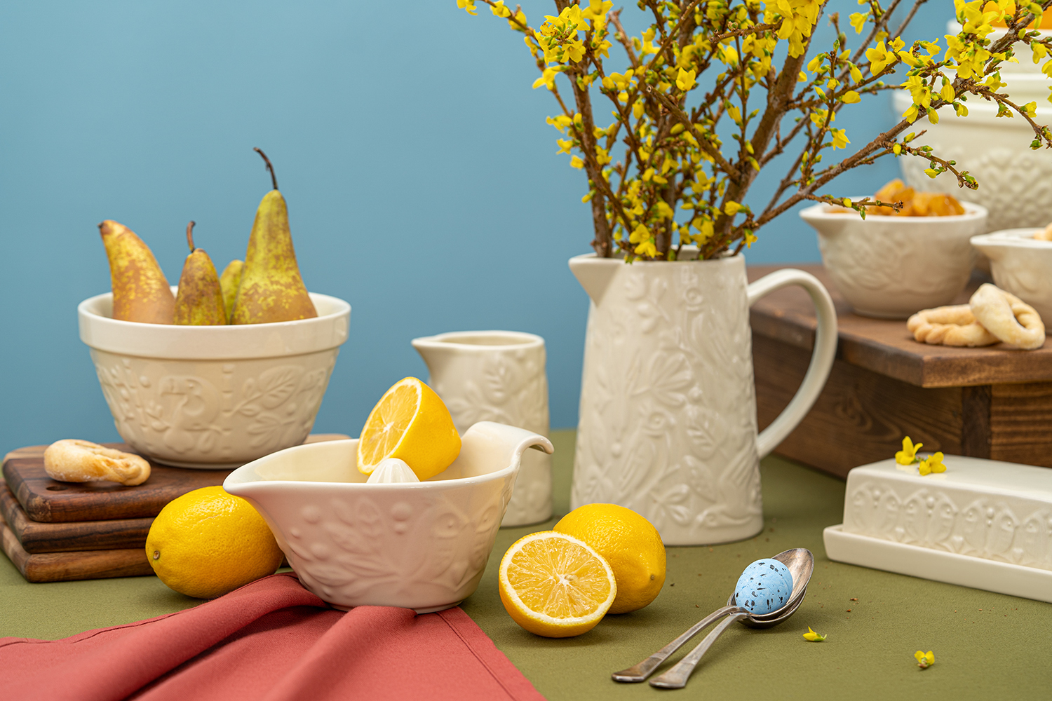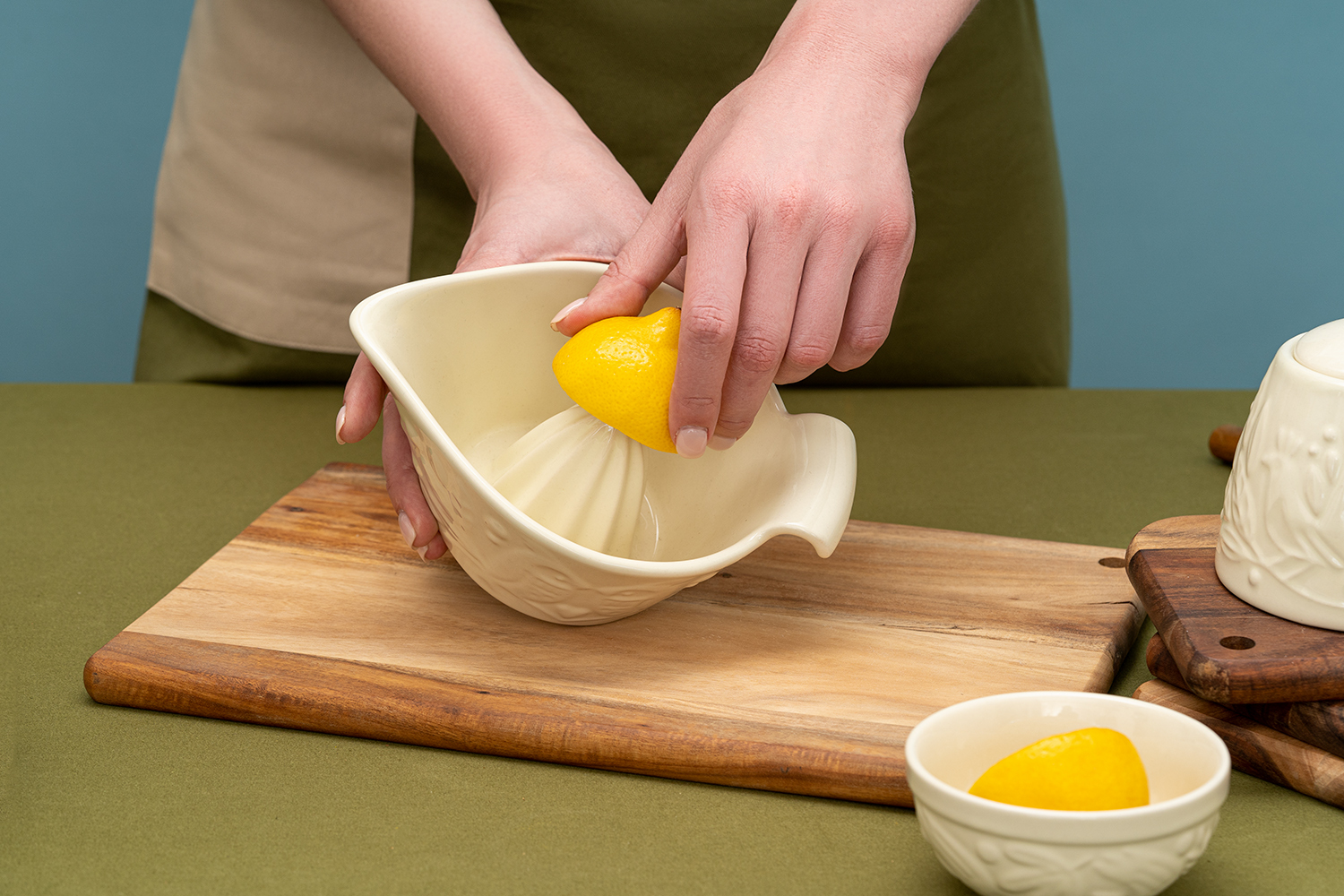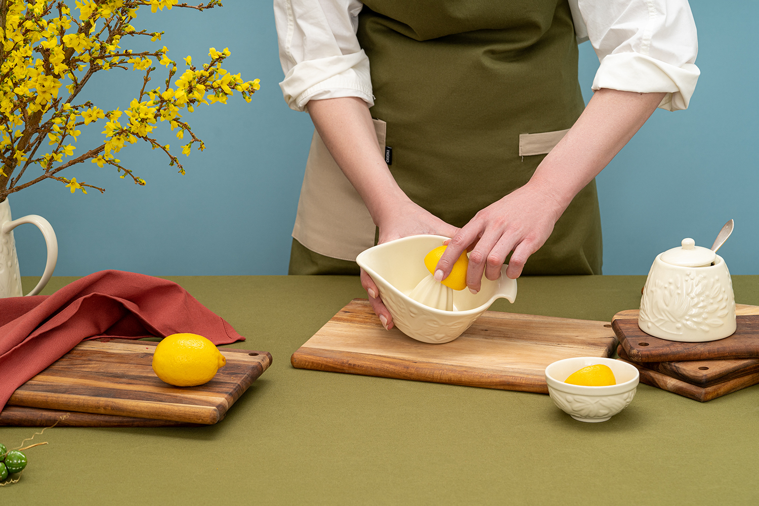 Соковыжималка для цитрусовых из коллекции Birds of Paradise – качественная посуда из экологичной каменной керамики, которая облегчает процесс готовки и делает интерьер любой кухни более уютным. Отличительной особенностью серии является объемный узор природной тематики, добавляющий дизайну элегантные нотки. Благодаря высокой прочности и устойчивости материала к износу изделие не теряет привлекательный внешний вид на протяжении всего срока службы. Покрытие глазурью облегчает уход, обеспечивает декоративность и дополнительную защиту от внешних воздействий. Соковыжималка имеет широкую чашу со специальным “носиком” для аккуратного переливания сока и ручкой для удобного захвата. Она проста в применении и легко очищается после использования.