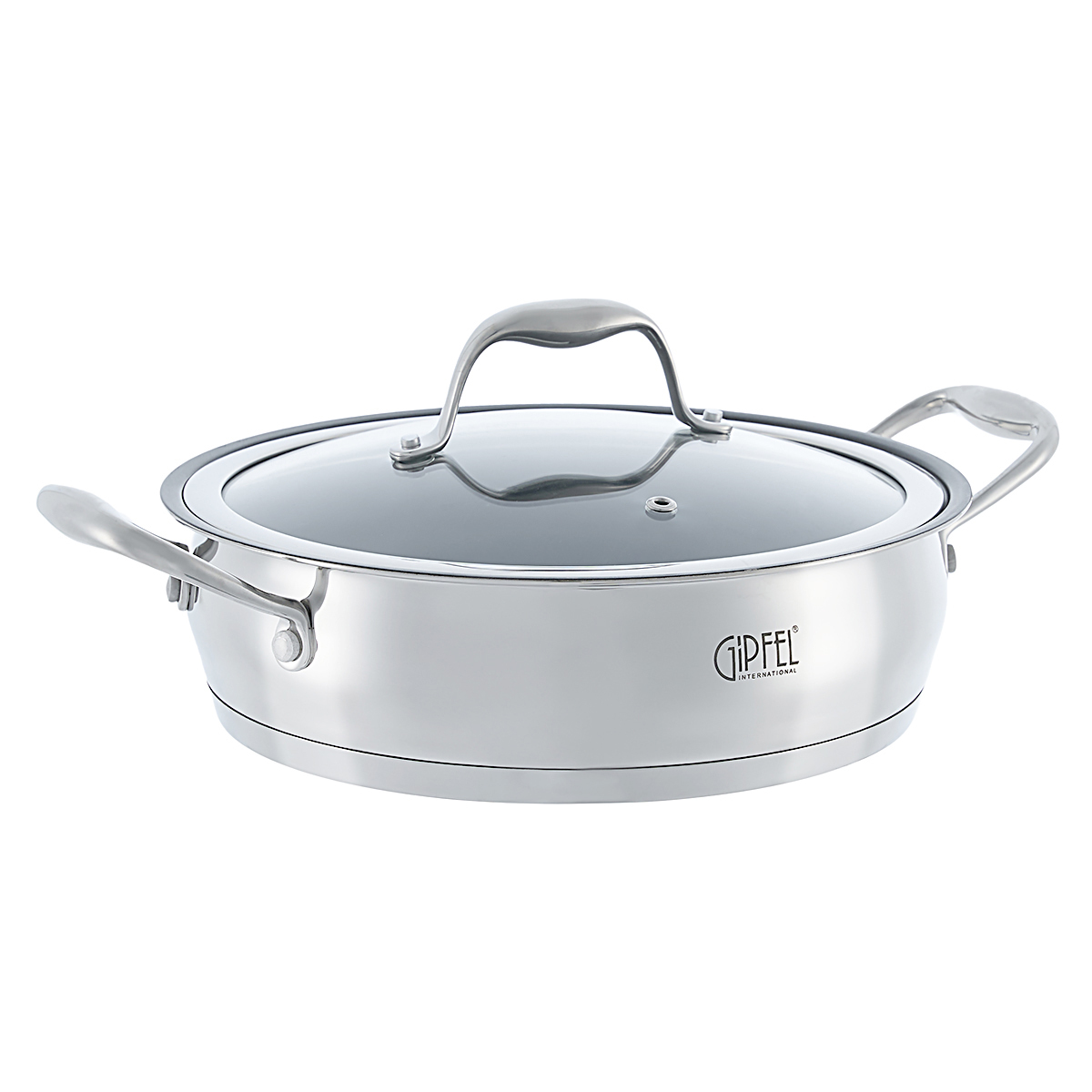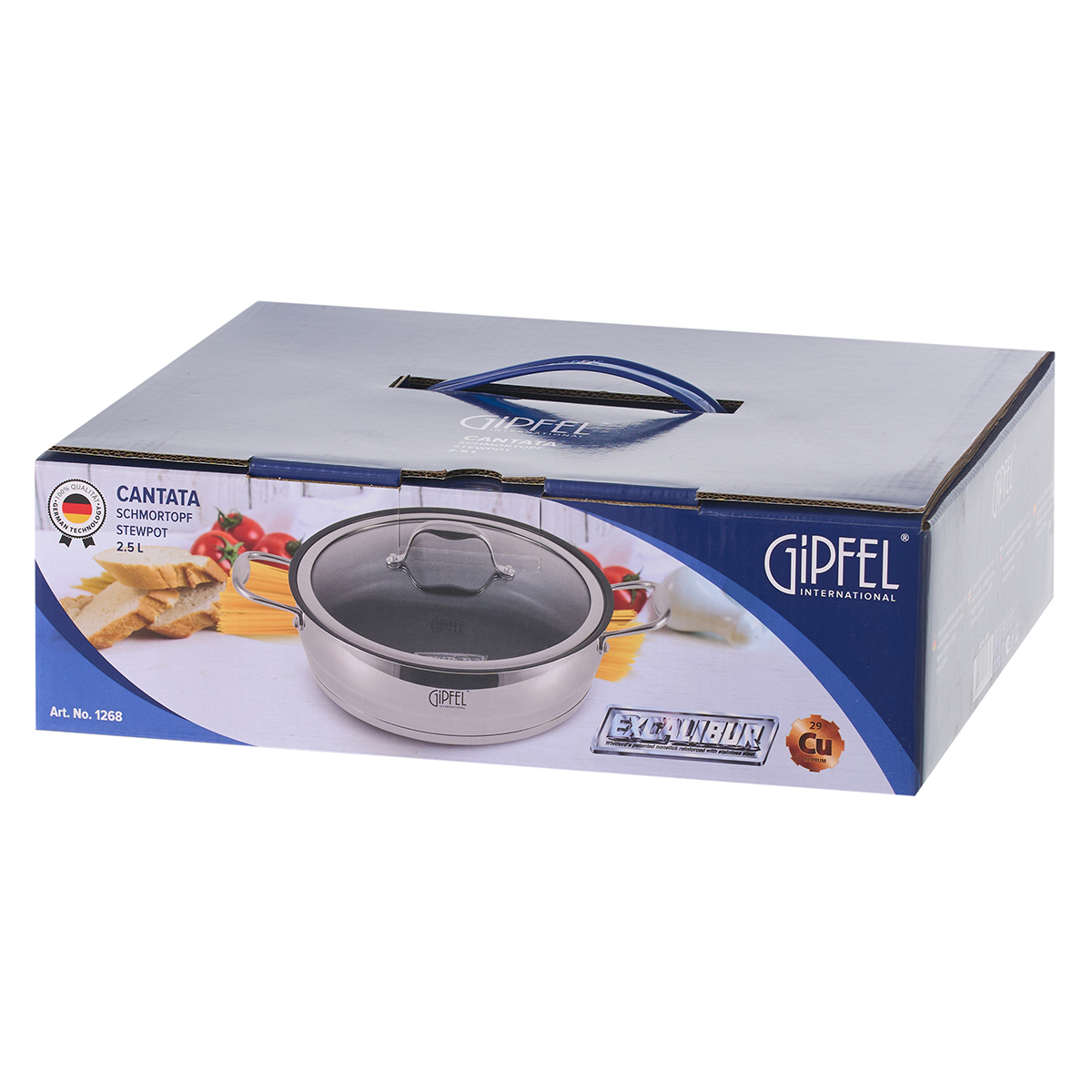 Сотейник Gipfel Cantata 1268. Размер 24x6,5 см, объем 2,5 л с антипригарным покрытием Excalibur. Сотейник сделан из нержавеющей стали 18/10. Толщина стенок 0,7 мм.