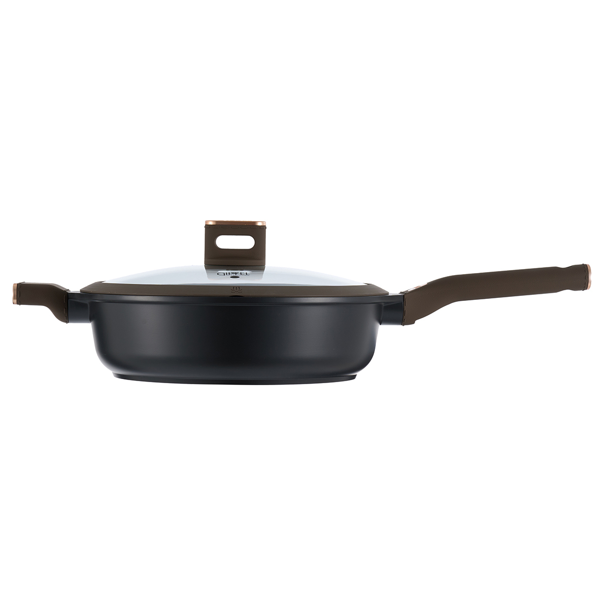 Сотейник Gipfel Taurus 52662. Размер 28х8 см. Изготовлен из литого алюминия с 4-слойным антипригарным мраморным покрытием Whitford QuanTanium, c бакелитовой ручкой с покрытием Soft-touch. Цвет: черный, коричневый.