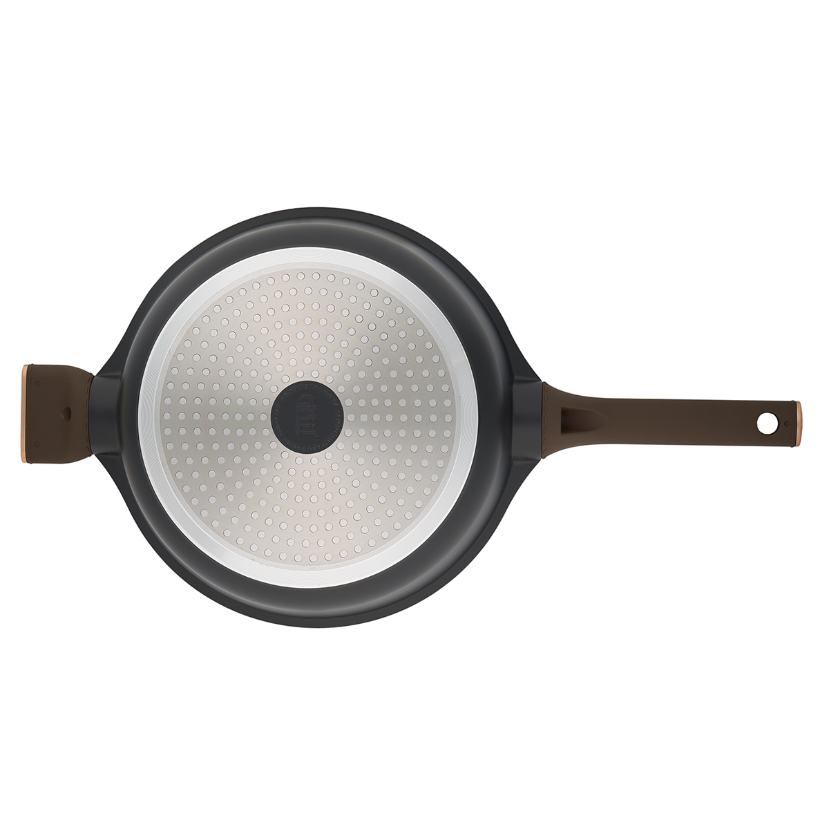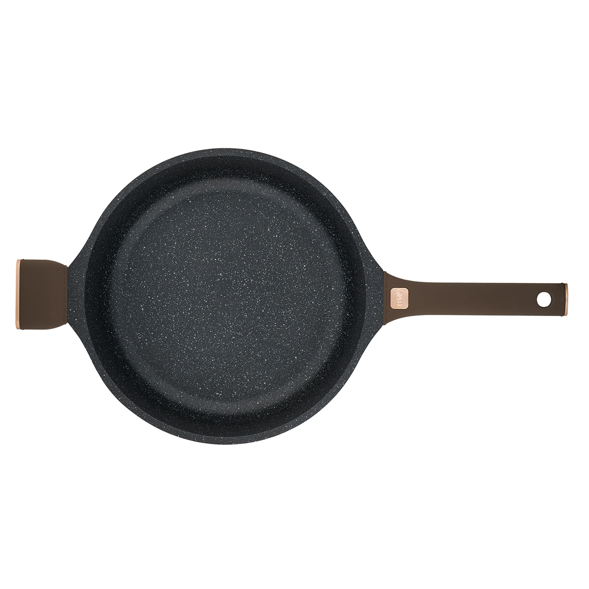 Сотейник выполнен в оригинальном дизайне в черно-коричневом цвете, внутри с белыми вкраплениями.