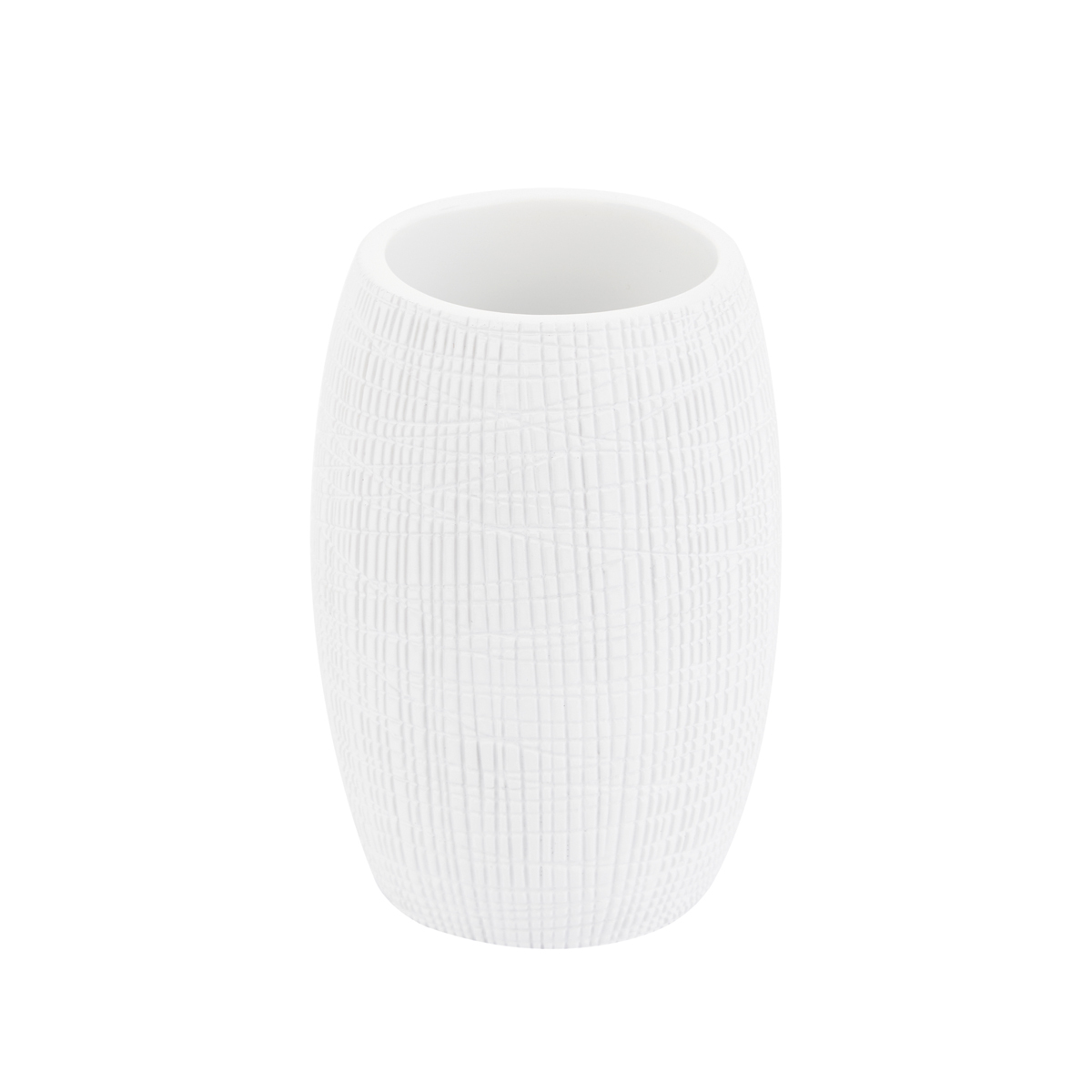 Стакан для ванной GIPFEL AFINA 43002. Диаметр 8,2см, высота 11,3см. Стакан сделан из белой полирезины с рельефным рисунком штрихами.