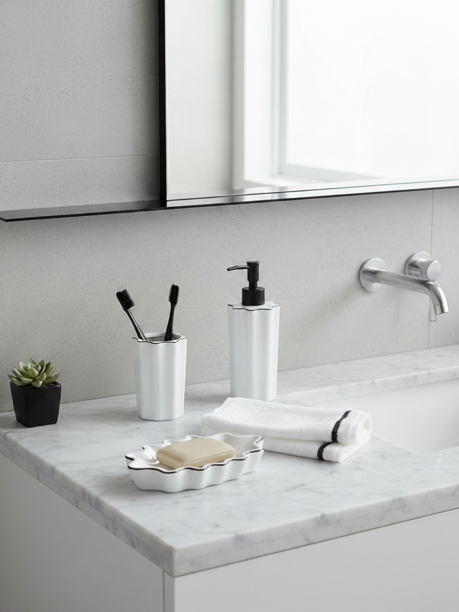 - Классический белый цвет с черной акцентной окантовкой подойдет для любого интерьера ванной комнаты.