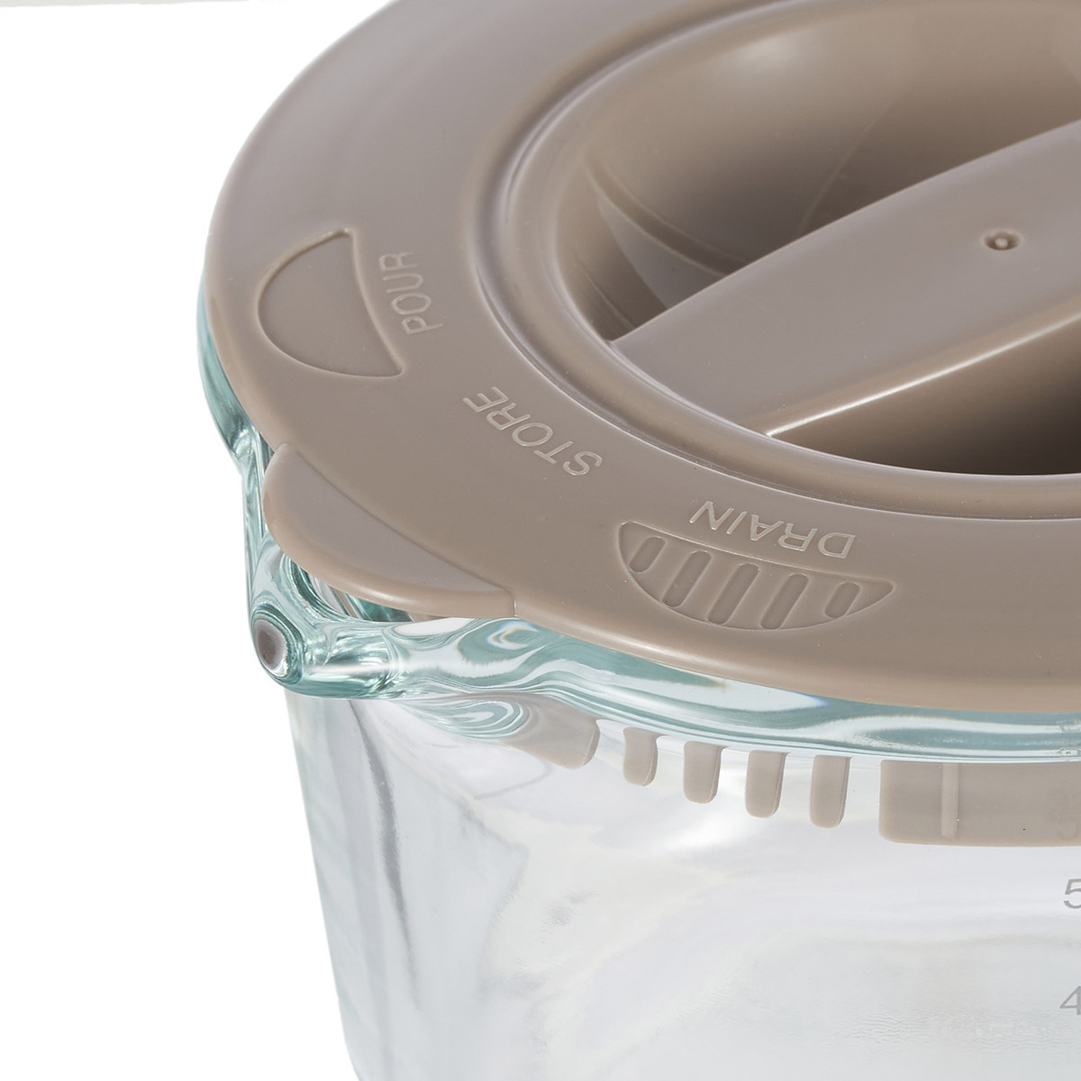 Плотная крышка предотвращает непроизвольное выливание и высыпание продуктов и оснащена отверстиями, позволяющими слить либо процедить содержимое.