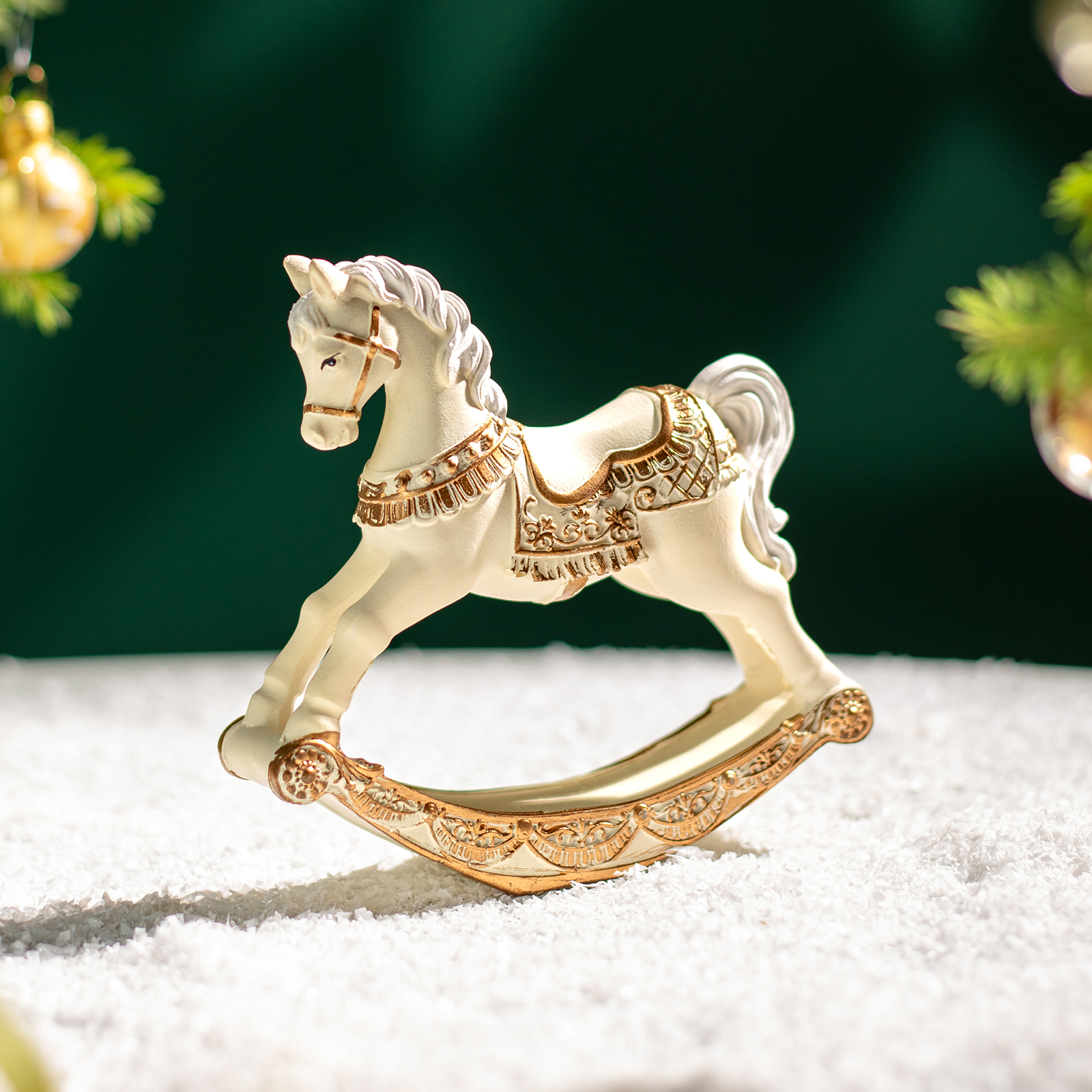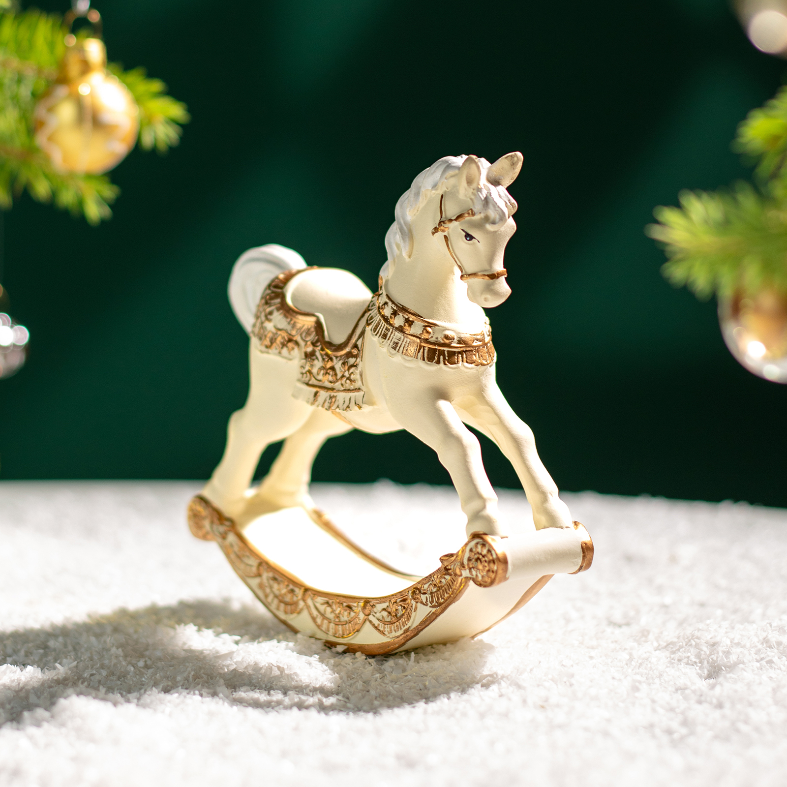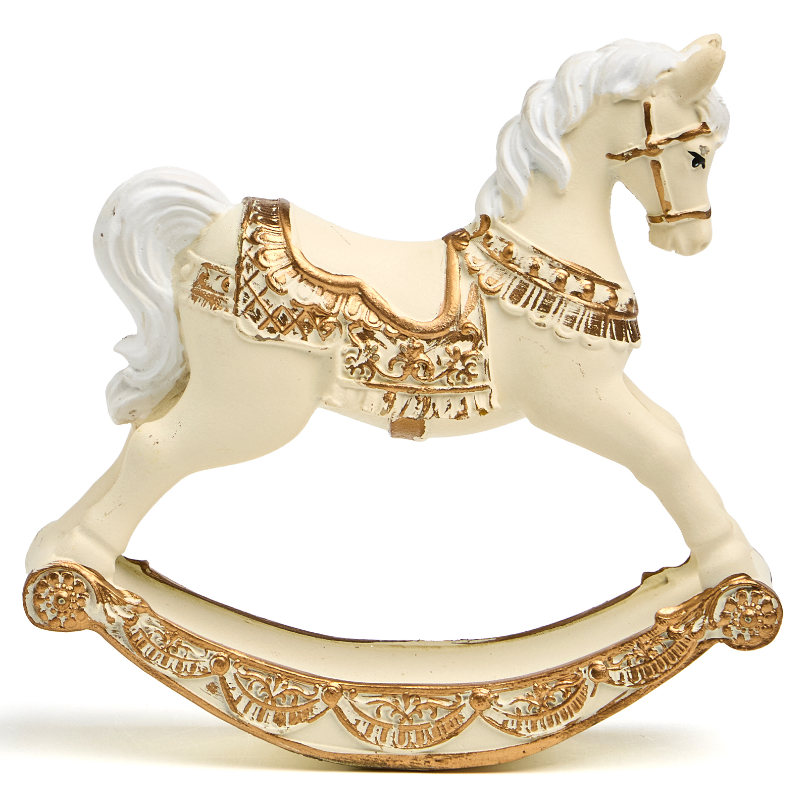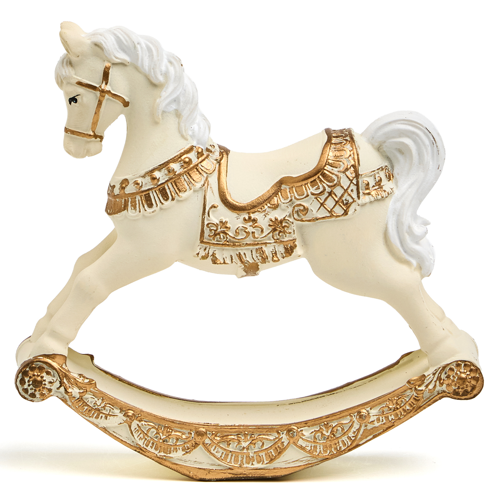 Пусть ваш дом наполнится нежностью и воспоминаниями — с этой изысканной статуэткой коня-качалки из прочного и благородного полистоуна! Он словно вышел из старинного дворца или винтажной игрушечной лавки: белоснежный, с пышной гривой и хвостом, украшенный золотыми узорами на седле, уздечке и дугах качалки — каждая деталь продумана до мелочей, чтобы вызывать улыбку и тёплые чувства.