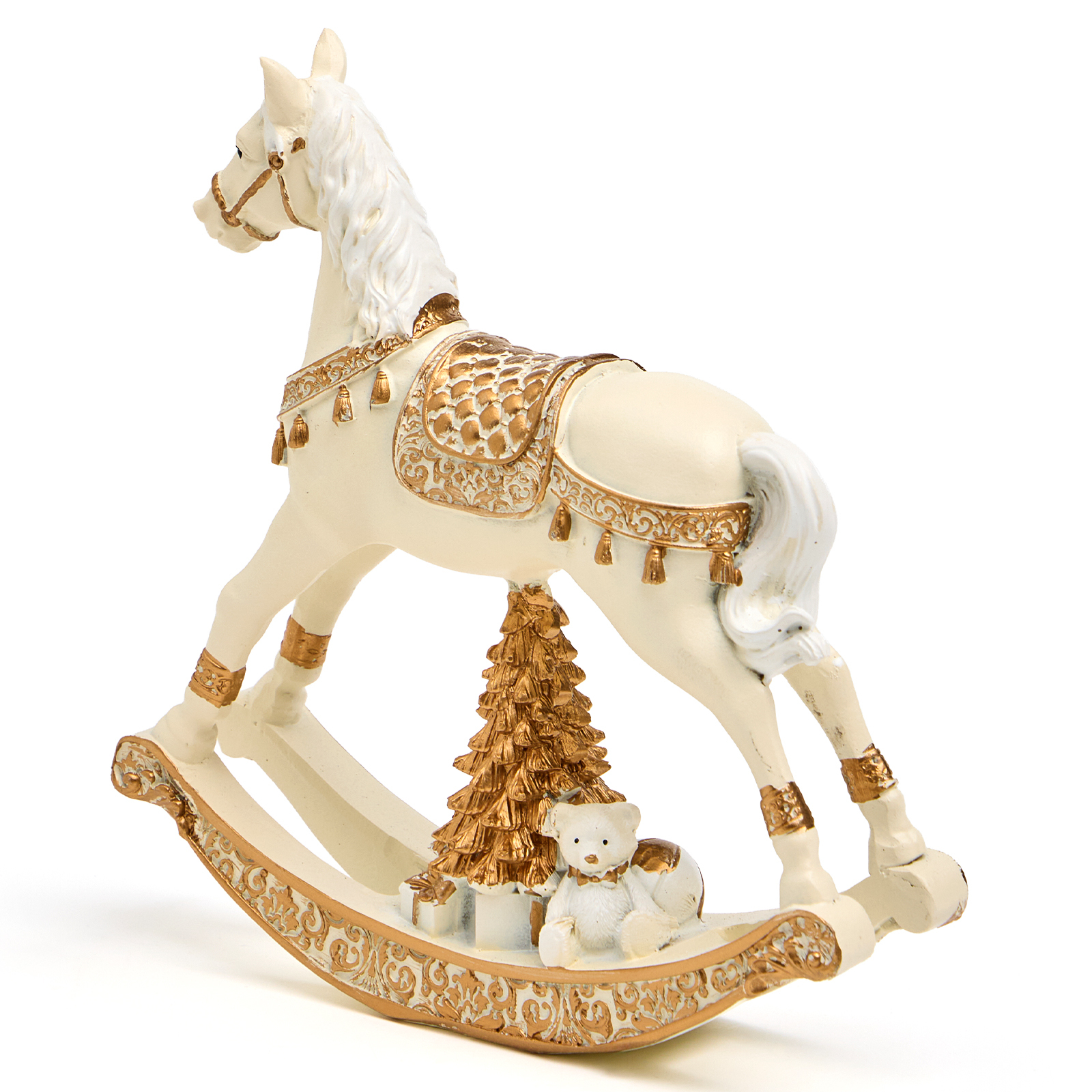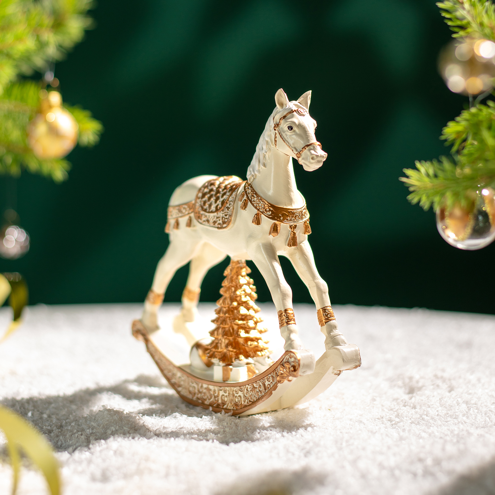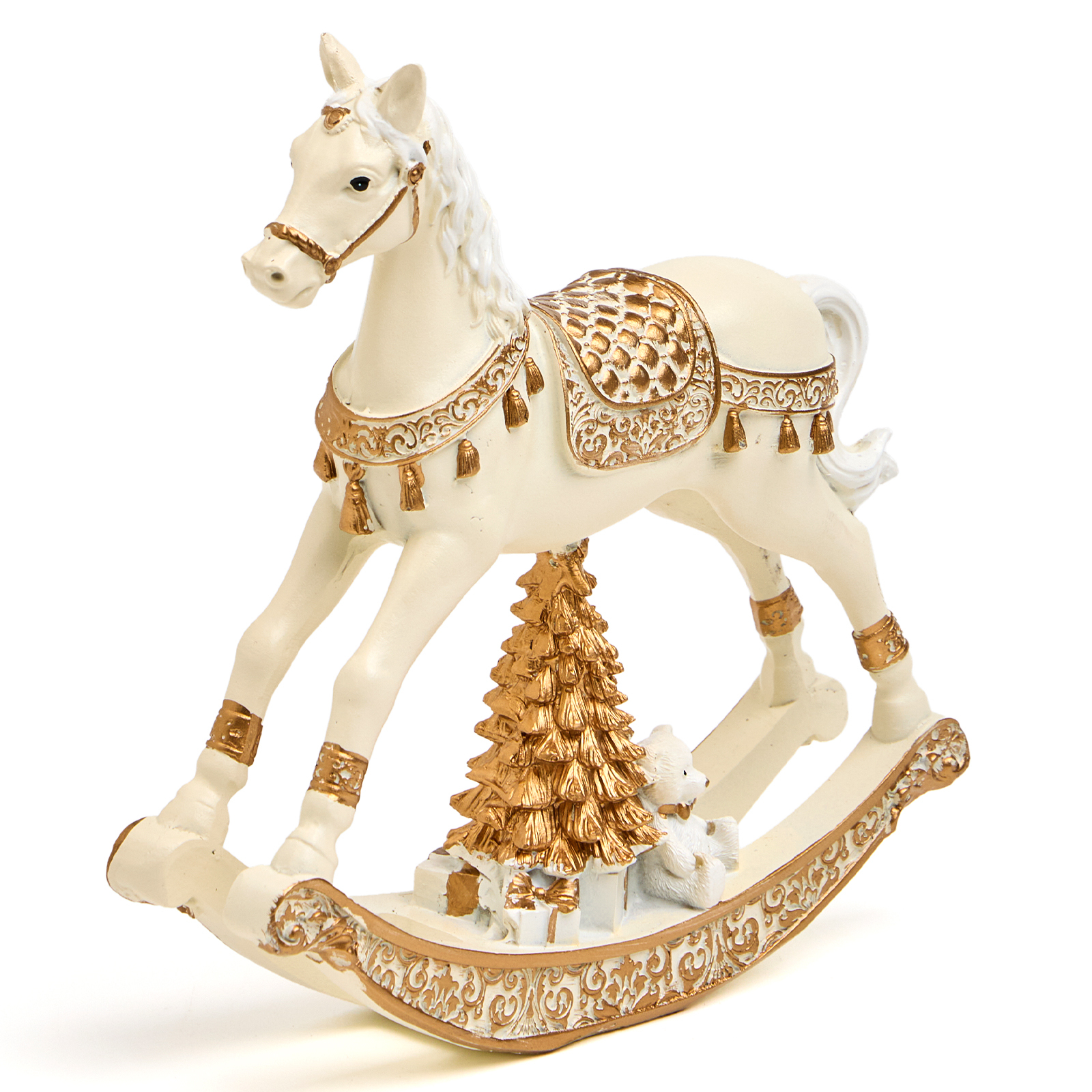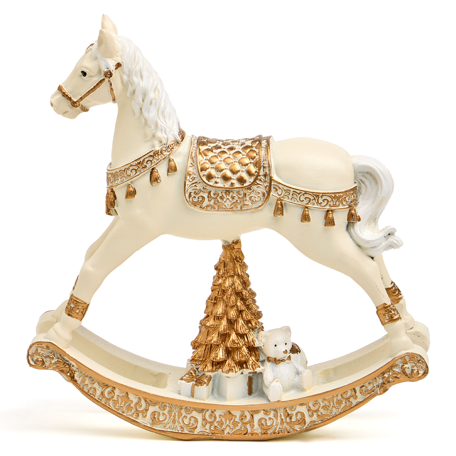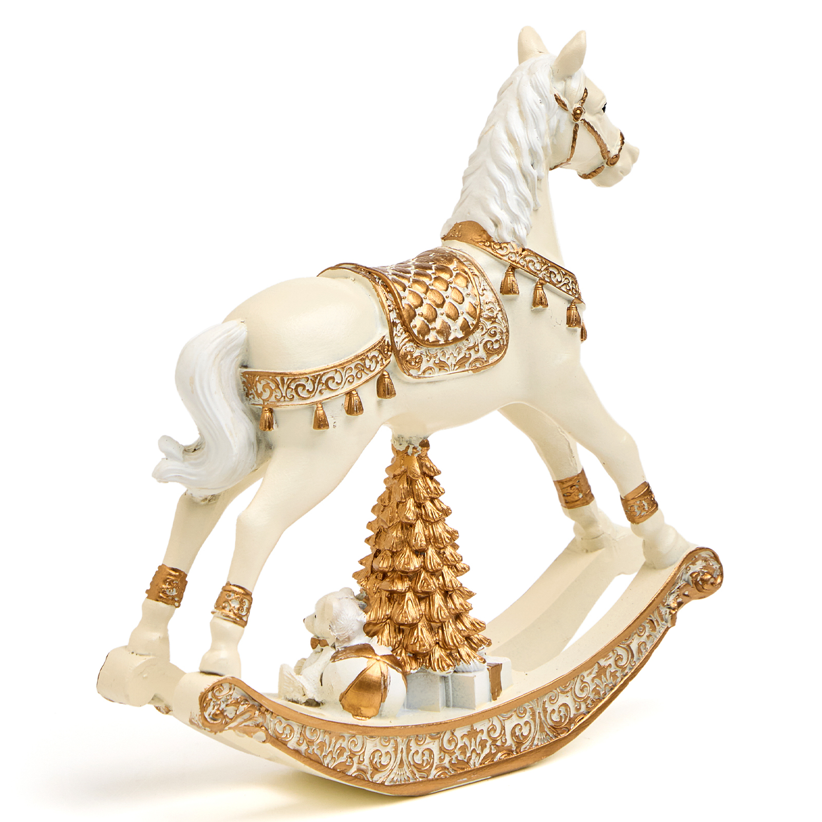 Пусть ваш дом наполнится теплом воспоминаний и волшебством детства — с этой очаровательной статуэткой коня-качалки из прочного и благородного полистоуна! Он словно вышел из старинной игрушечной лавки: белоснежный, с золотыми узорами на седле и уздечке, пышной гривой и изящными дугами качалки — а под ним — миниатюрная золотая ёлочка с подарками и маленький мишка, будто ждут, пока начнётся праздник.