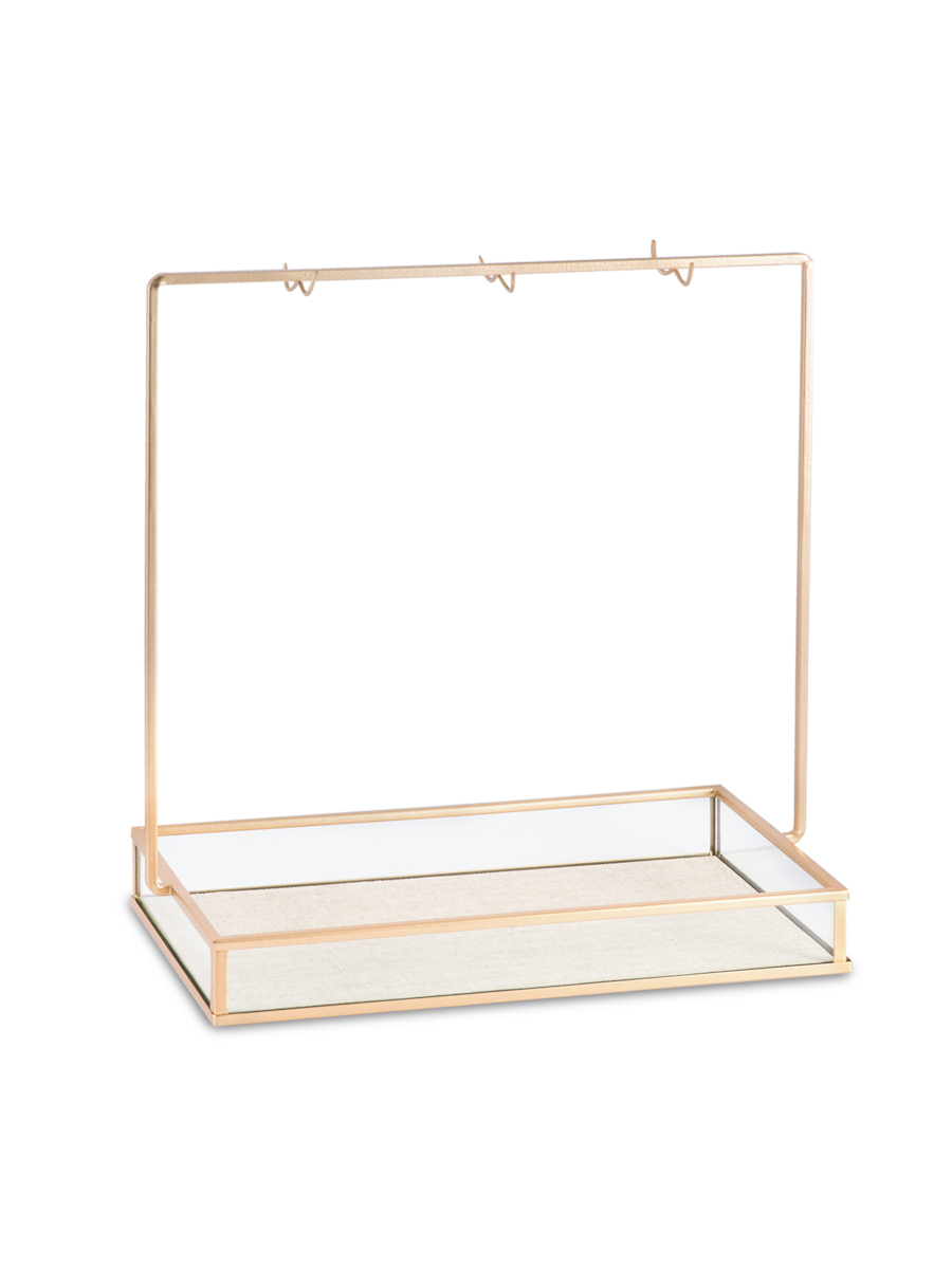 Поднос-органайзер Gipfel GRADUATO 40103 декоративный со стойкой и крючками для украшений. Поднос имеет высокие стеклянные прозрачные бортики. Каркас сделан из железа с золотистым напылением. На дне подноса размещен льняной коврик бежевого цвета. Размер подноса 24х14х7,5 см.