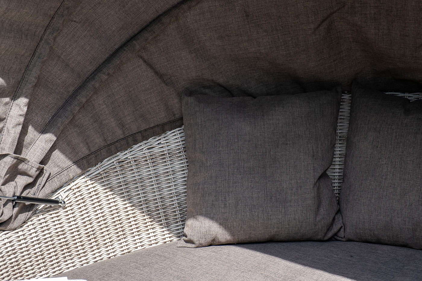 Данная модель имеет в основании прочный алюминиевый каркас, оплетенный вручную круглым ротангом бежевого цвета и оснащена регулируемым козырьком, который ограничивает попадание солнечных лучей. Выполнен из водостойкой полиэфирной ткани.