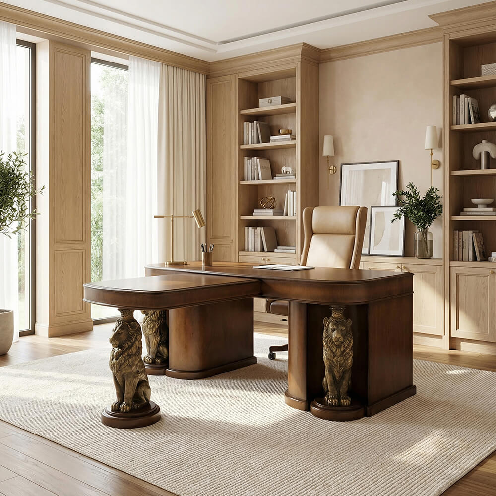 Три благородных льва являются опорой для столешницы из плитного материала Мдф, который изготавливается путём спрессовывания древесной крошки под высоким давлением, благодаря чему изделие очень прочное и лёгкое. Поверхность шпонирована натуральным деревом дуба, тонирована и покрыта лаком. Из этого же материала сделан пьедестал, на котором расположены скульптуры. Боковые поверхности выполнены из гибкой фанеры «фивьера» - дерево сейба. Львы отлиты вручную из мрамора высокого качества и окрашены в технике патинирование.