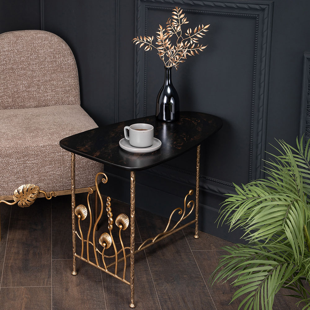 Столик декоративный «Блюм» — утончённый акцент для интерьера, созданный, чтобы подчеркнуть вкус и стиль хозяев дома. Изделие выполнено на прочных ножках из кованой стали, что обеспечивает устойчивость и долговечность. Легкий силуэт и изысканный дизайн позволяют использовать столик как самостоятельный элемент декора или как функциональную деталь в гостиной, спальне или прихожей.