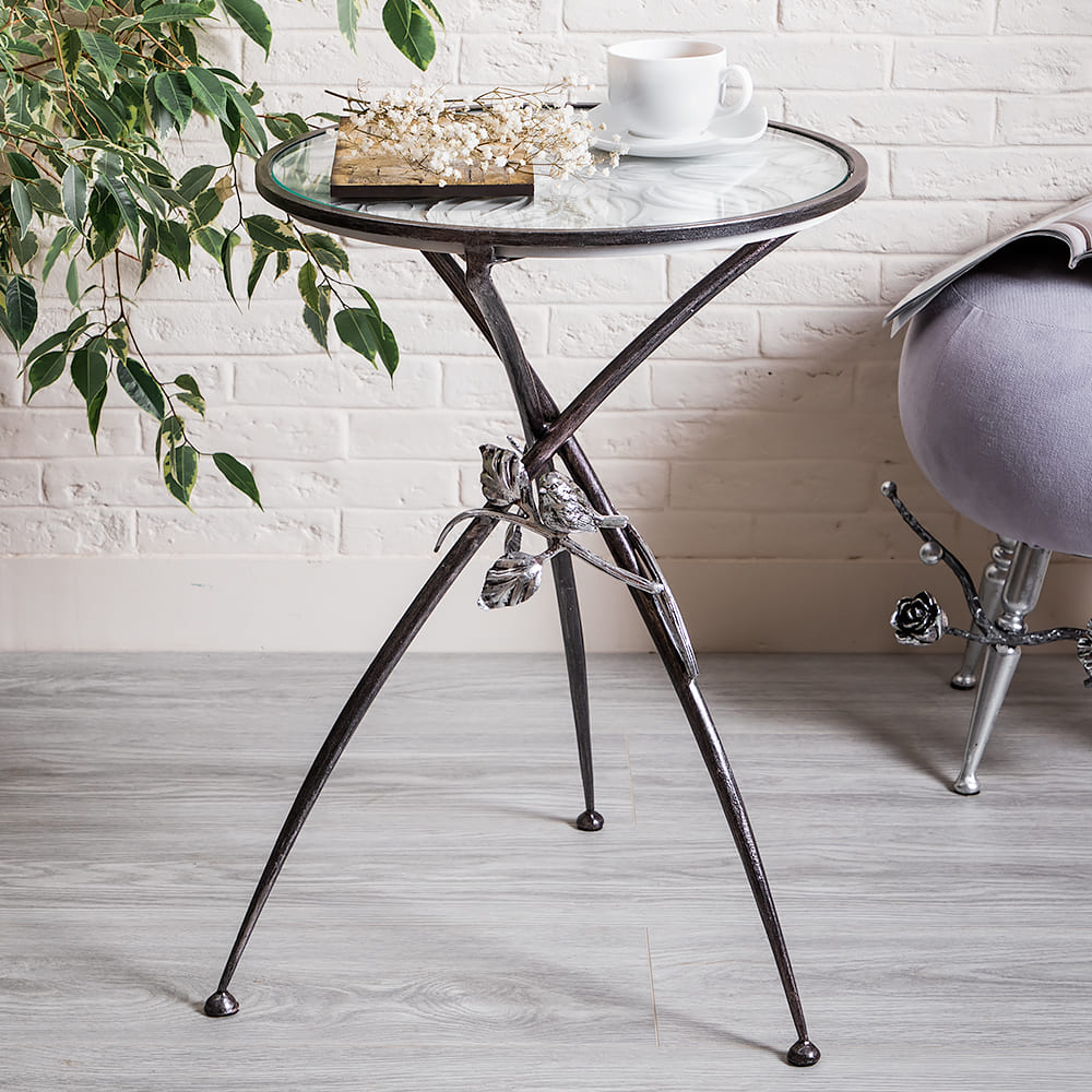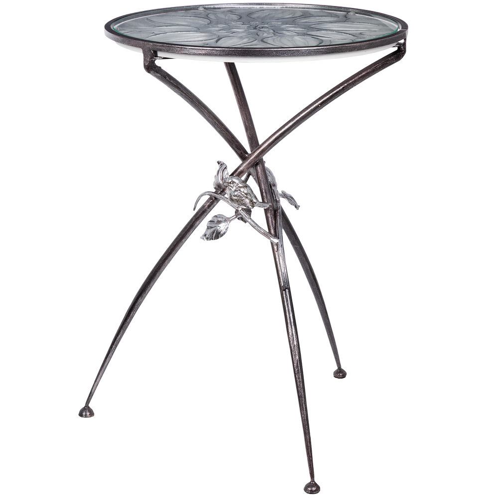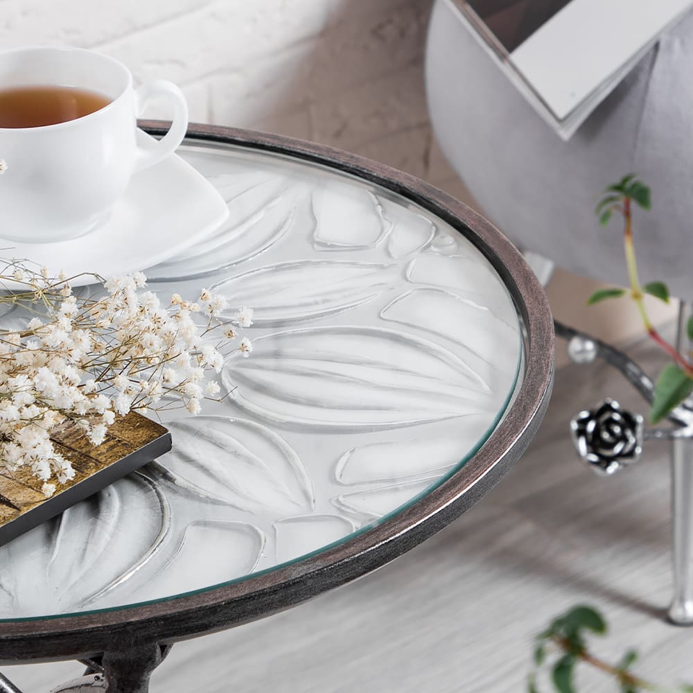 Декоративный столик BOGACHO Зарнички Санфлауэр серебристый, со стеклянной столешницей и основанием из кованой стали (ручная работа) – это оригинальный дизайн, изысканность и высочайшее качество исполнения. Он выполнен вручную, что делает его уникальным, единственным в своем роде!Большой цветок и маленькие птички на нем – этот образ во все времена нес в себе положительную энергетику. Коллекция «Зарнички» - дань той красоте, которой щедро окружает нас природа, экостиль, столь популярный в последнее время.Наполните образ своего дома оригинальностью и неповторимостью вместе с эксклюзивными изделиями BOGACHO.