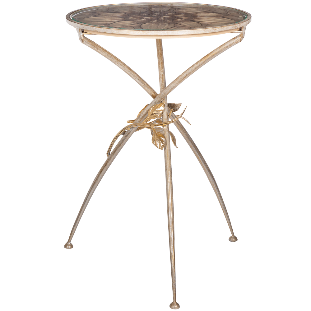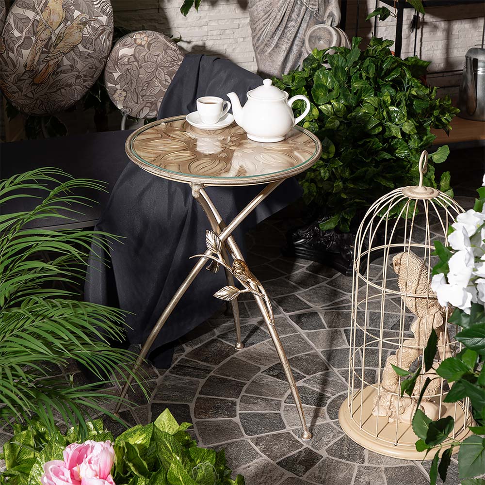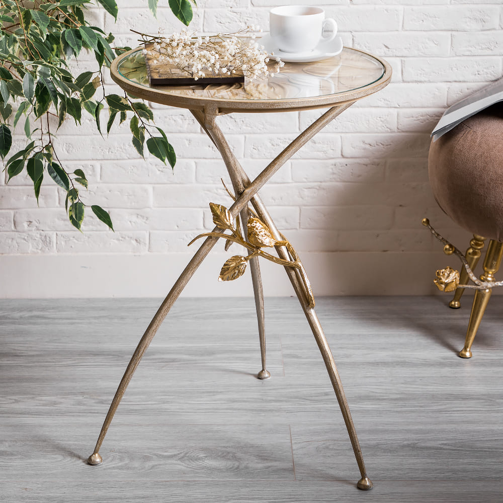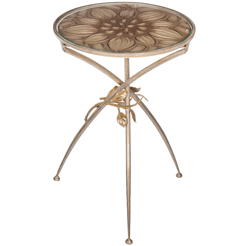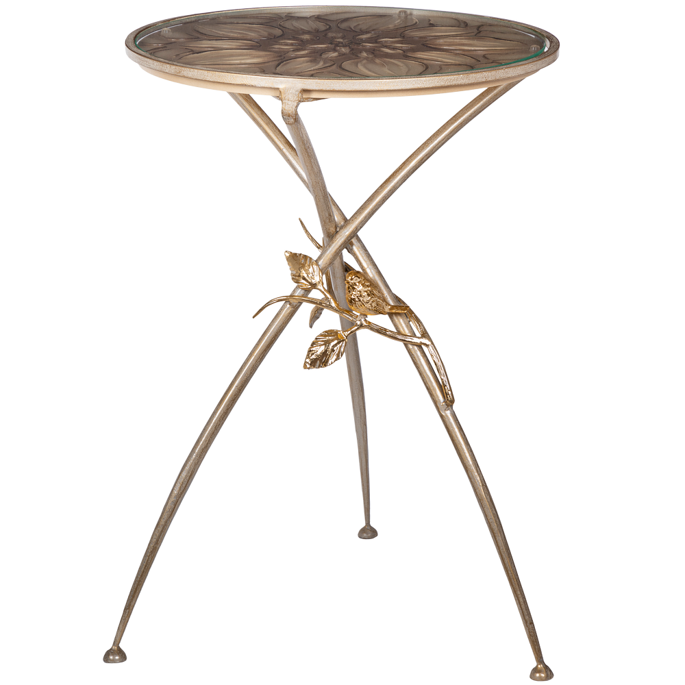 Декоративный столик BOGACHO Зарнички Санфлауэр золотистый, со стеклянной столешницей и основанием из кованой стали (ручная работа) – это оригинальный дизайн, изысканность и высочайшее качество исполнения. Он выполнен вручную, что делает его уникальным, единственным в своем роде!Большой цветок и маленькие птички на нем – этот образ во все времена нес в себе положительную энергетику. Коллекция «Зарнички» - дань той красоте, которой щедро окружает нас природа, экостиль, столь популярный в последнее время.Наполните образ своего дома оригинальностью и неповторимостью вместе с эксклюзивными изделиями BOGACHO.