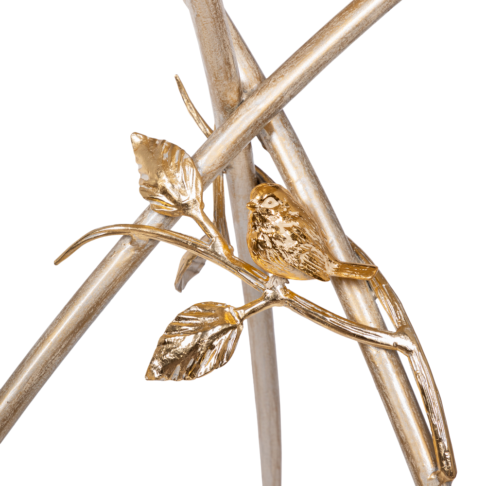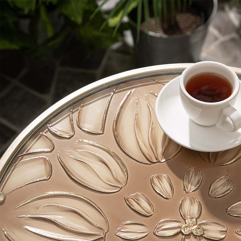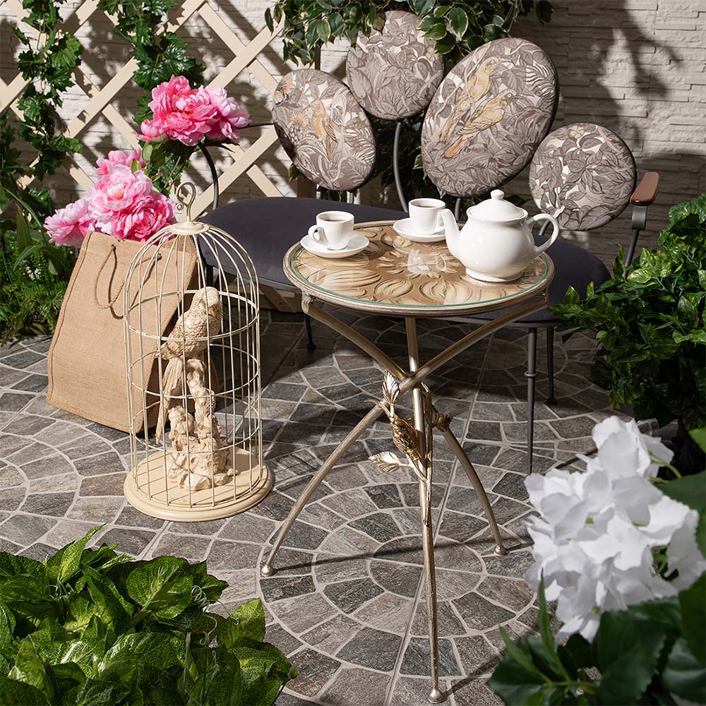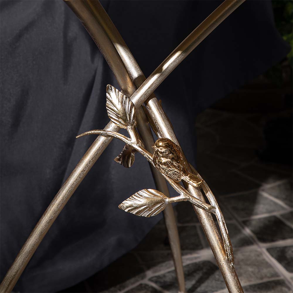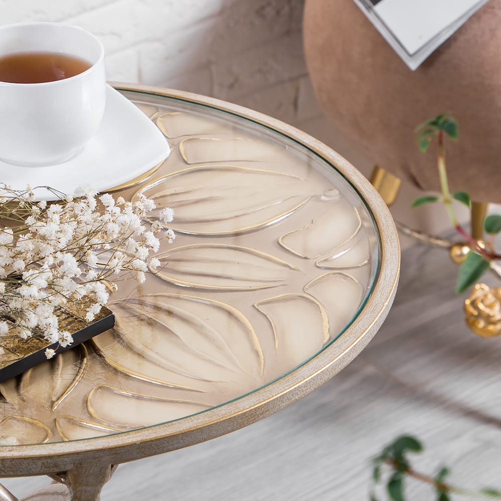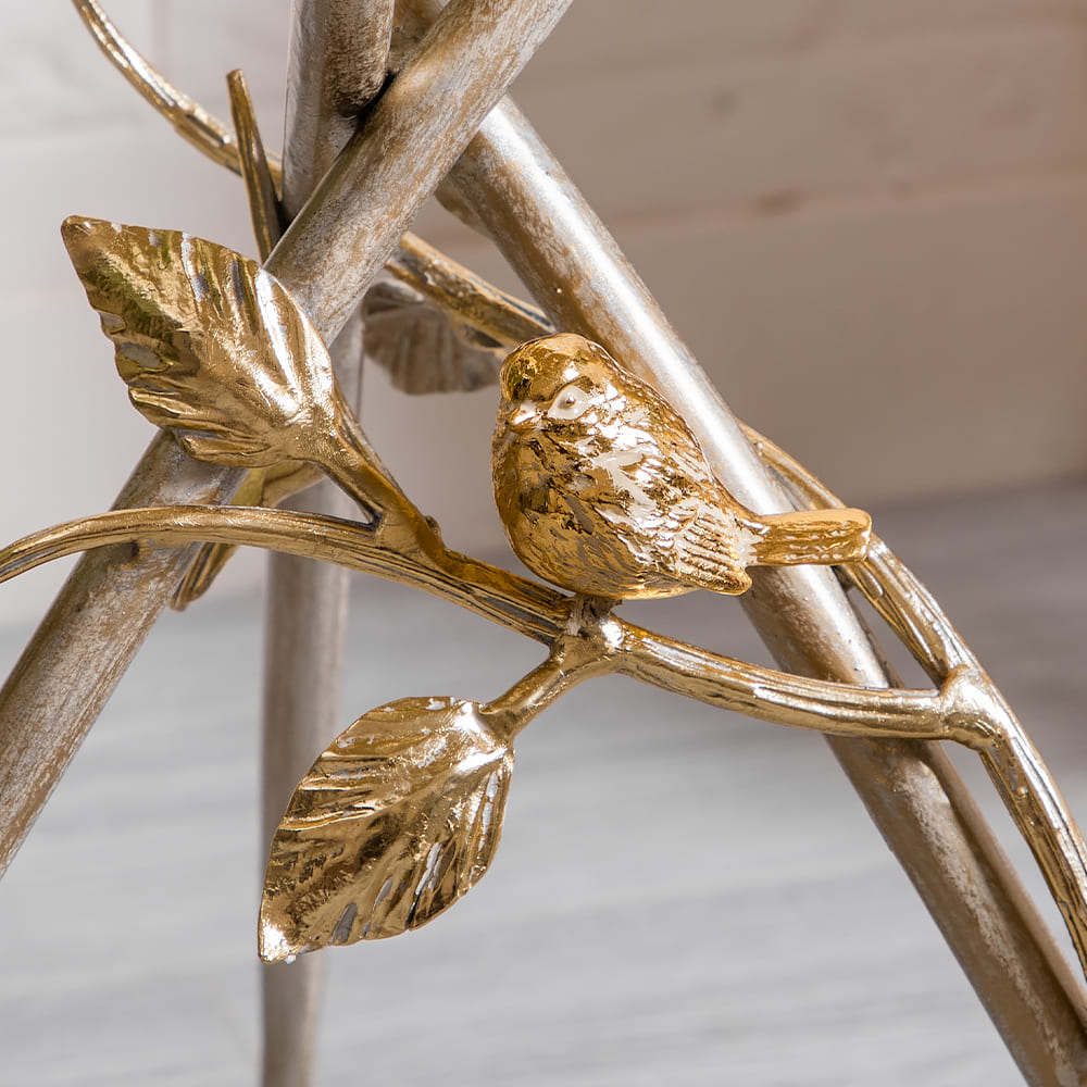 Декоративный столик BOGACHO Зарнички Санфлауэр золотистый, со стеклянной столешницей и основанием из кованой стали (ручная работа) – это оригинальный дизайн, изысканность и высочайшее качество исполнения. Он выполнен вручную, что делает его уникальным, единственным в своем роде!Большой цветок и маленькие птички на нем – этот образ во все времена нес в себе положительную энергетику. Коллекция «Зарнички» - дань той красоте, которой щедро окружает нас природа, экостиль, столь популярный в последнее время.Наполните образ своего дома оригинальностью и неповторимостью вместе с эксклюзивными изделиями BOGACHO.