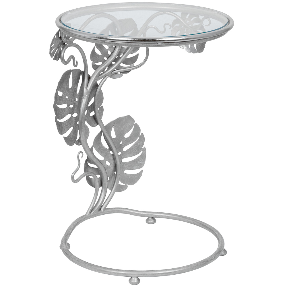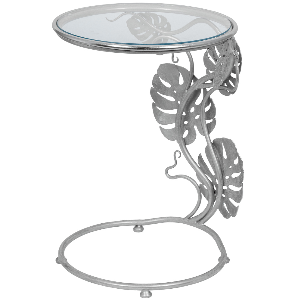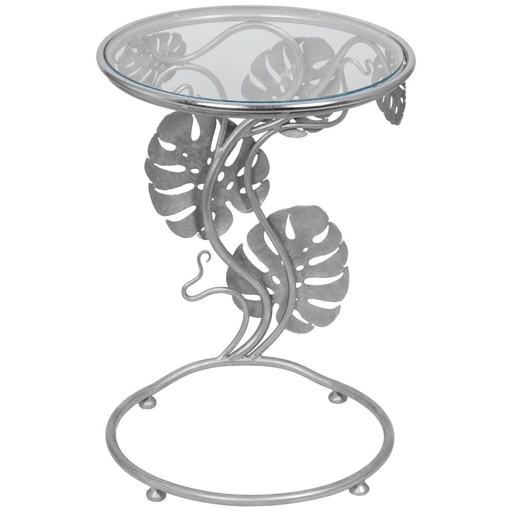 Приставной столик "Monstera" первого взгляда буквально покоряет своим необычным дизайном. Он украсит любую комнату (гостиную, столовую, просторную веранду) и станет заметным акцентом в интерьере. Cтолешница диаметром 43.5 см изготовлена из прочного стекла.