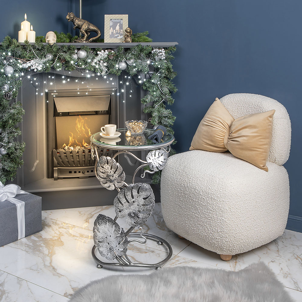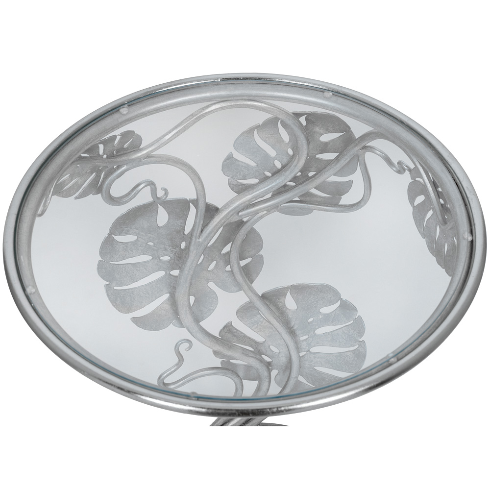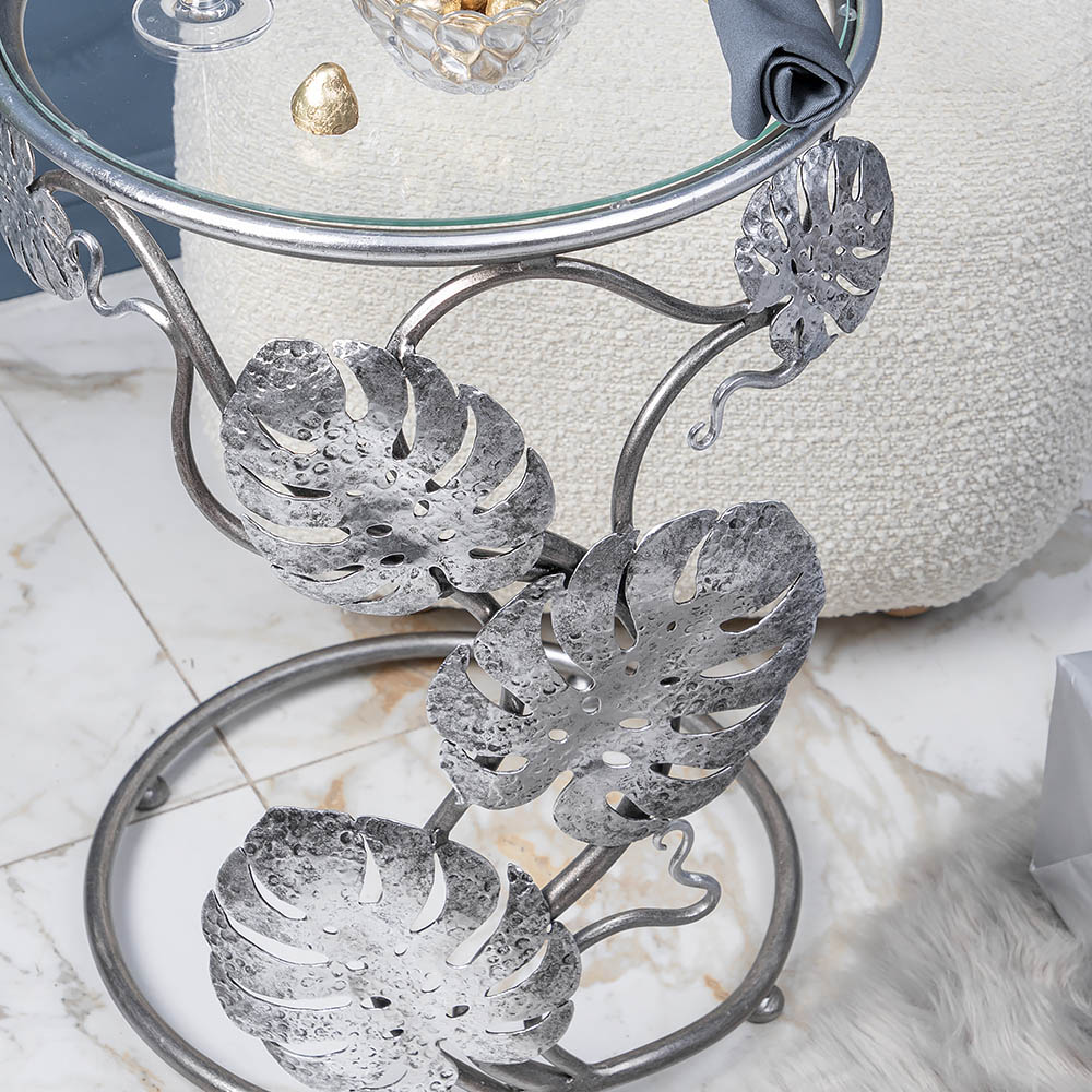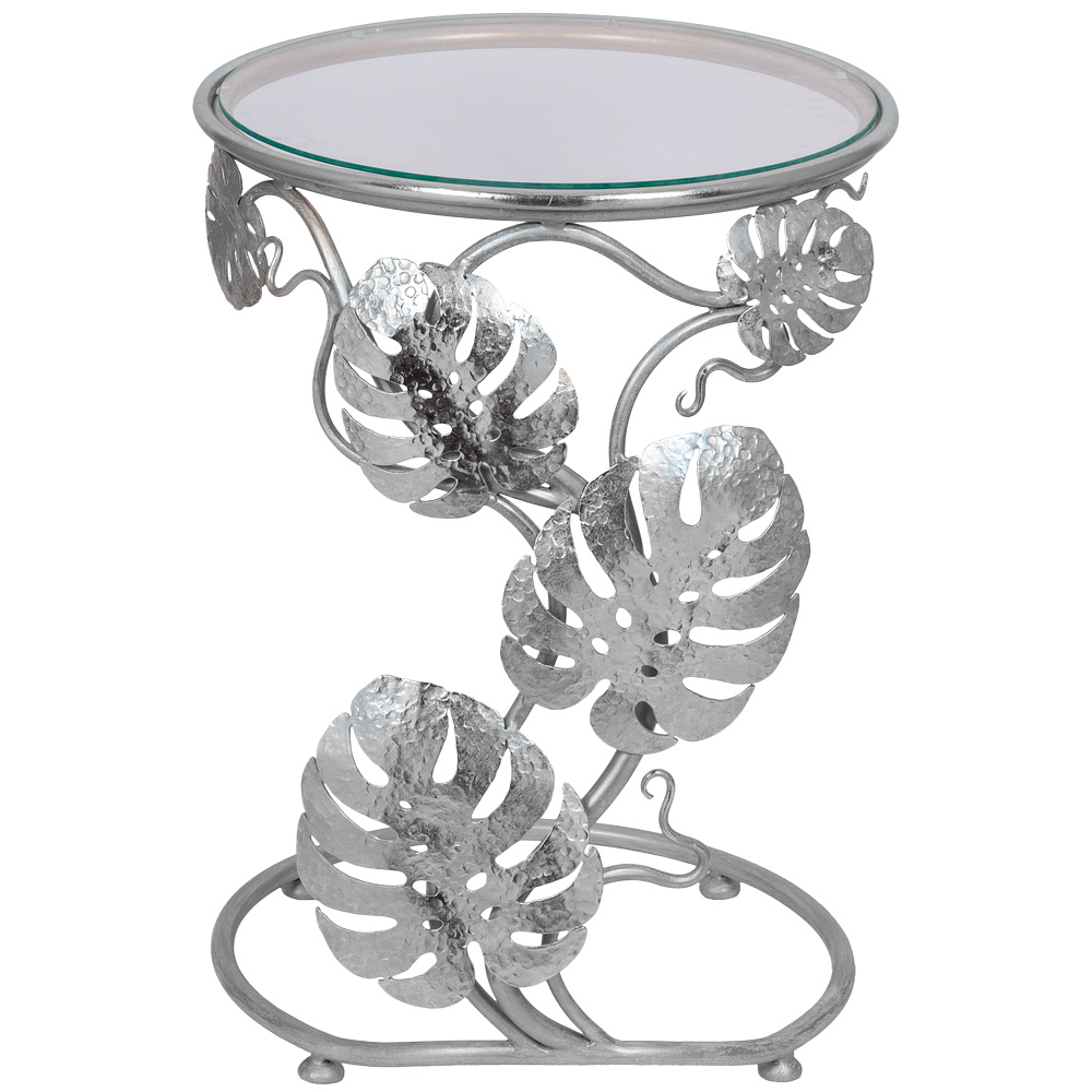 Приставной столик "Monstera" первого взгляда буквально покоряет своим необычным дизайном. Он украсит любую комнату (гостиную, столовую, просторную веранду) и станет заметным акцентом в интерьере. Cтолешница диаметром 43.5 см изготовлена из прочного стекла.
