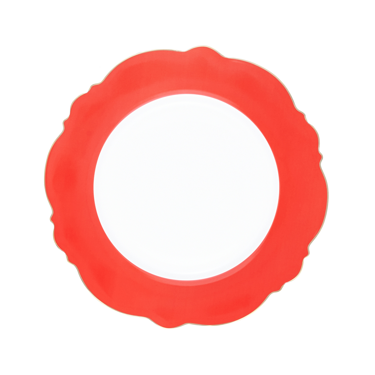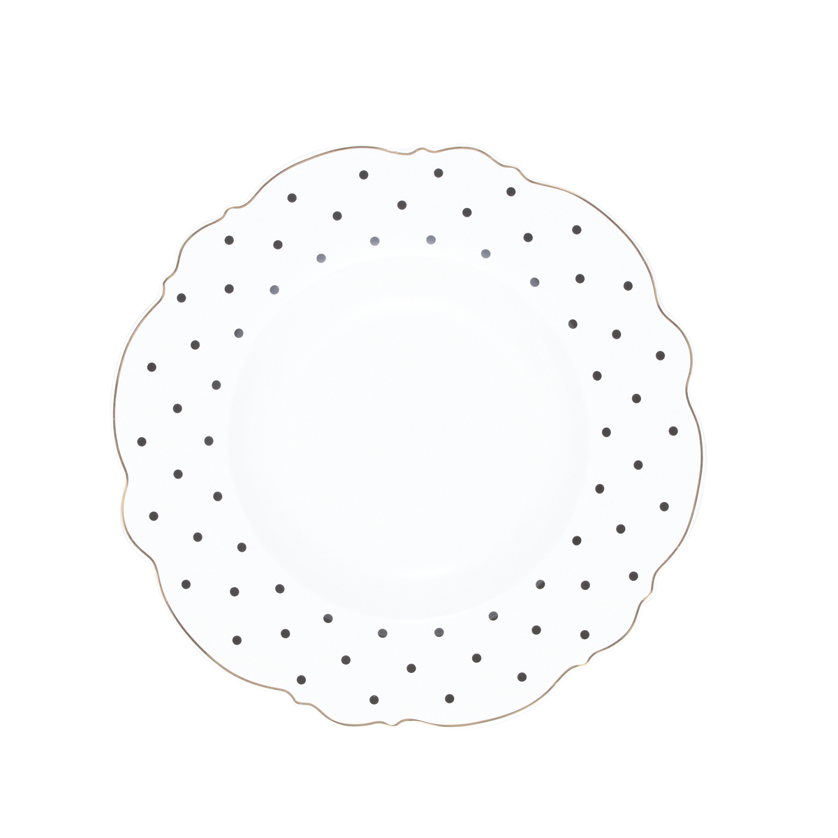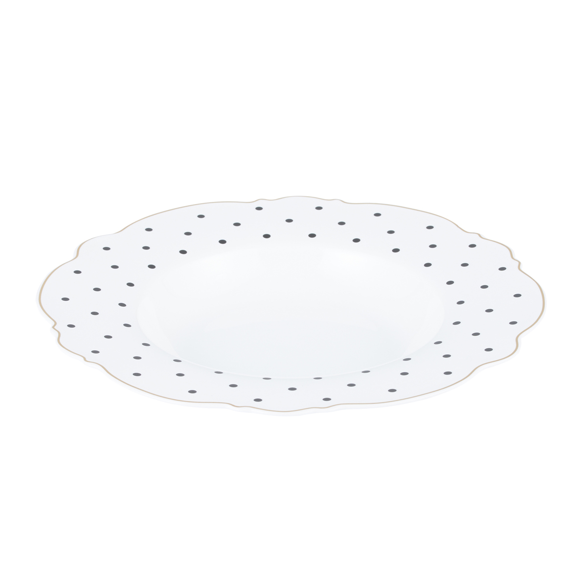 Сервиз столовый GIPFEL MODERN 3873 на 6 персон, 18 предметов (6 белых с красным ободом обеденных тарелок 31см, 6 белых с черно-белым ободом закусочных тарелок 28см, 6 суповых тарелок белых в черный горох 23см). Материал: костяной фарфор