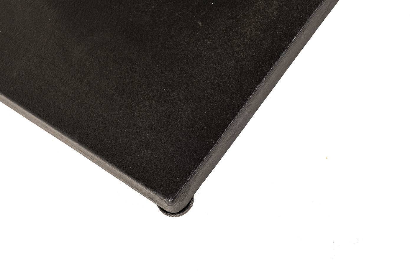 Подстолье изготовлено из чугуна черного цвета, с рамкой для крепления столешницы и широким основанием 400×400 мм.