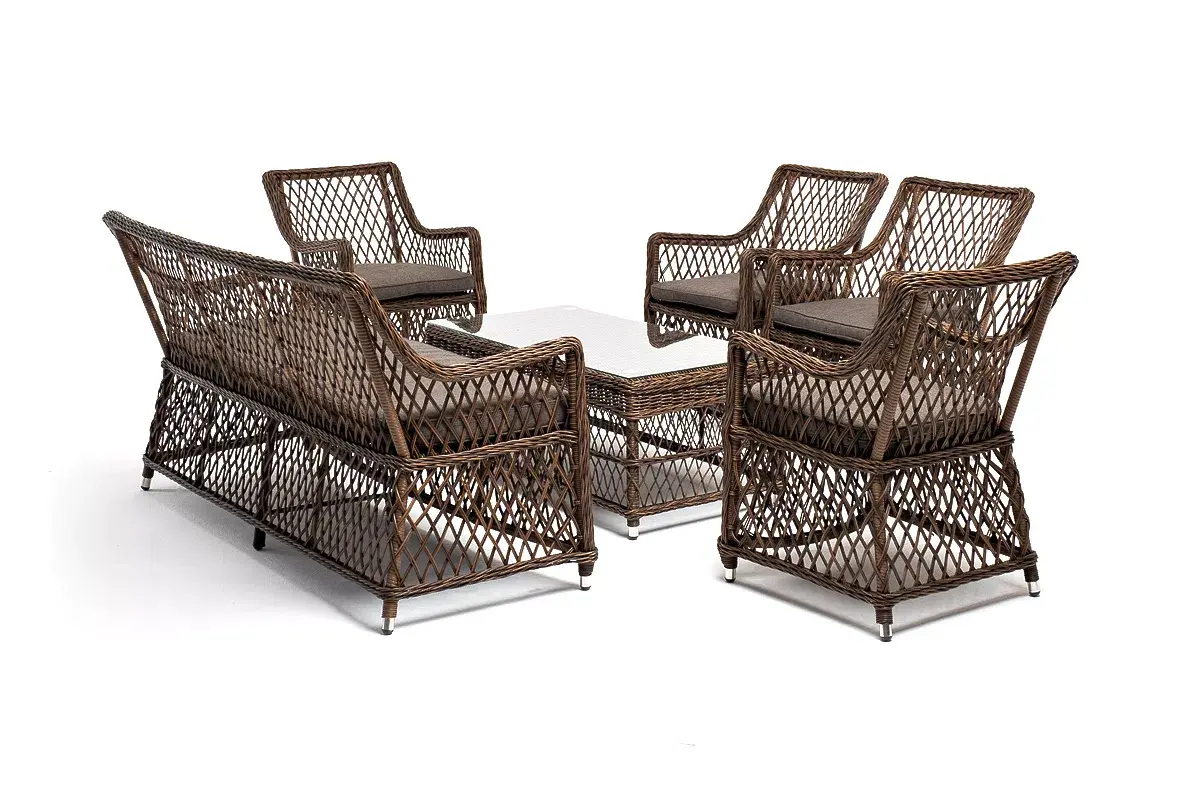 Оплетка выполнена вручную искусственным ротангом коричневого цвета, диван и кресло укомплектованы подушками из 100% полиэстера, которые пропитаны специальным составом, обладающим влагоотталкивающим свойством.
