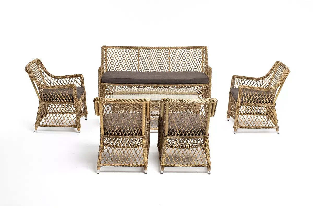 Оплетка выполнена вручную искусственным ротангом соломенного цвета, диван и кресло укомплектованы подушками из 100% полиэстера, которые пропитаны специальным составом, обладающим влагоотталкивающим свойством.