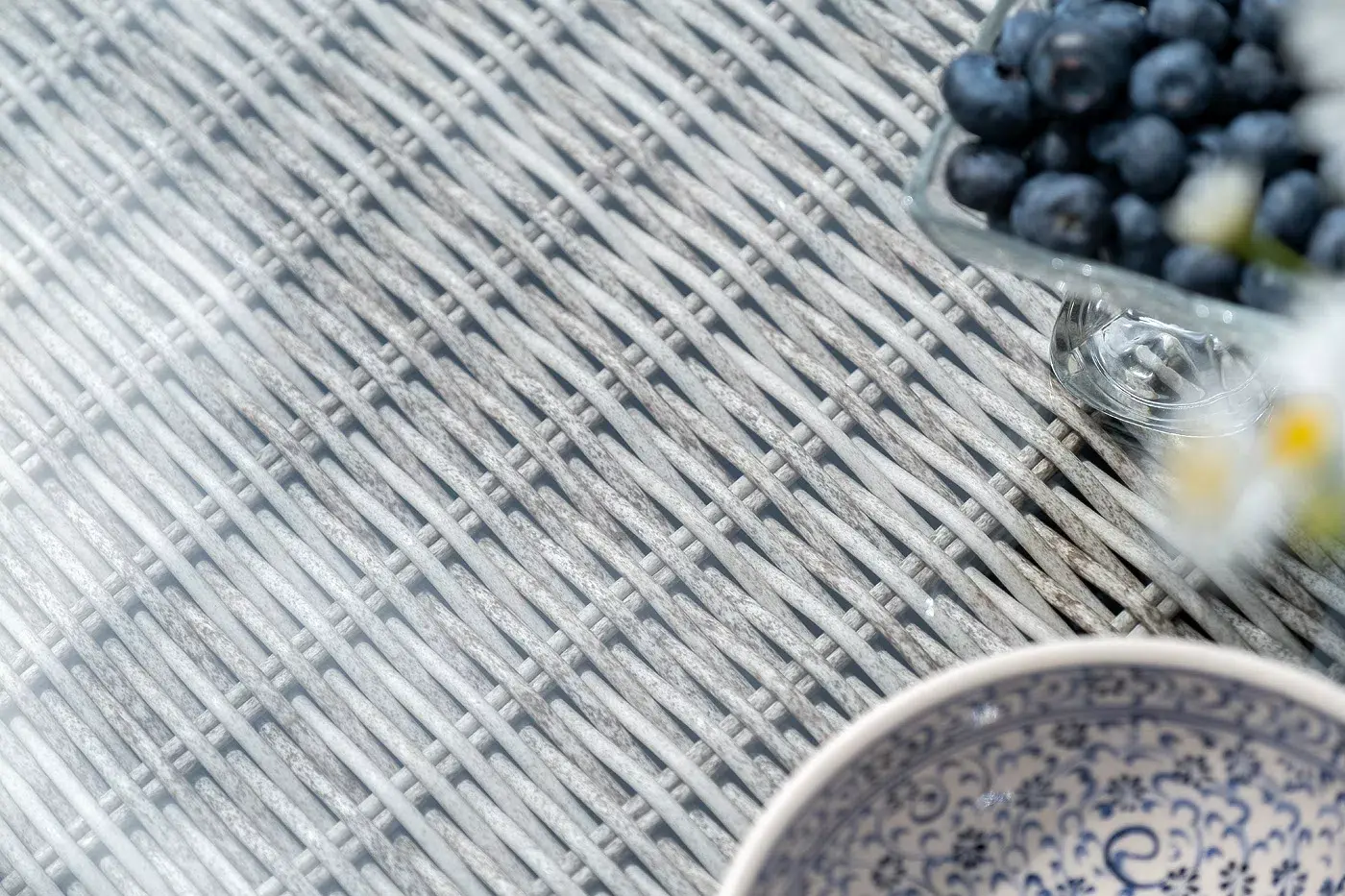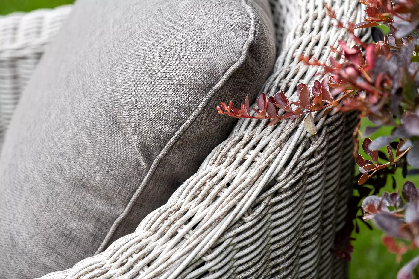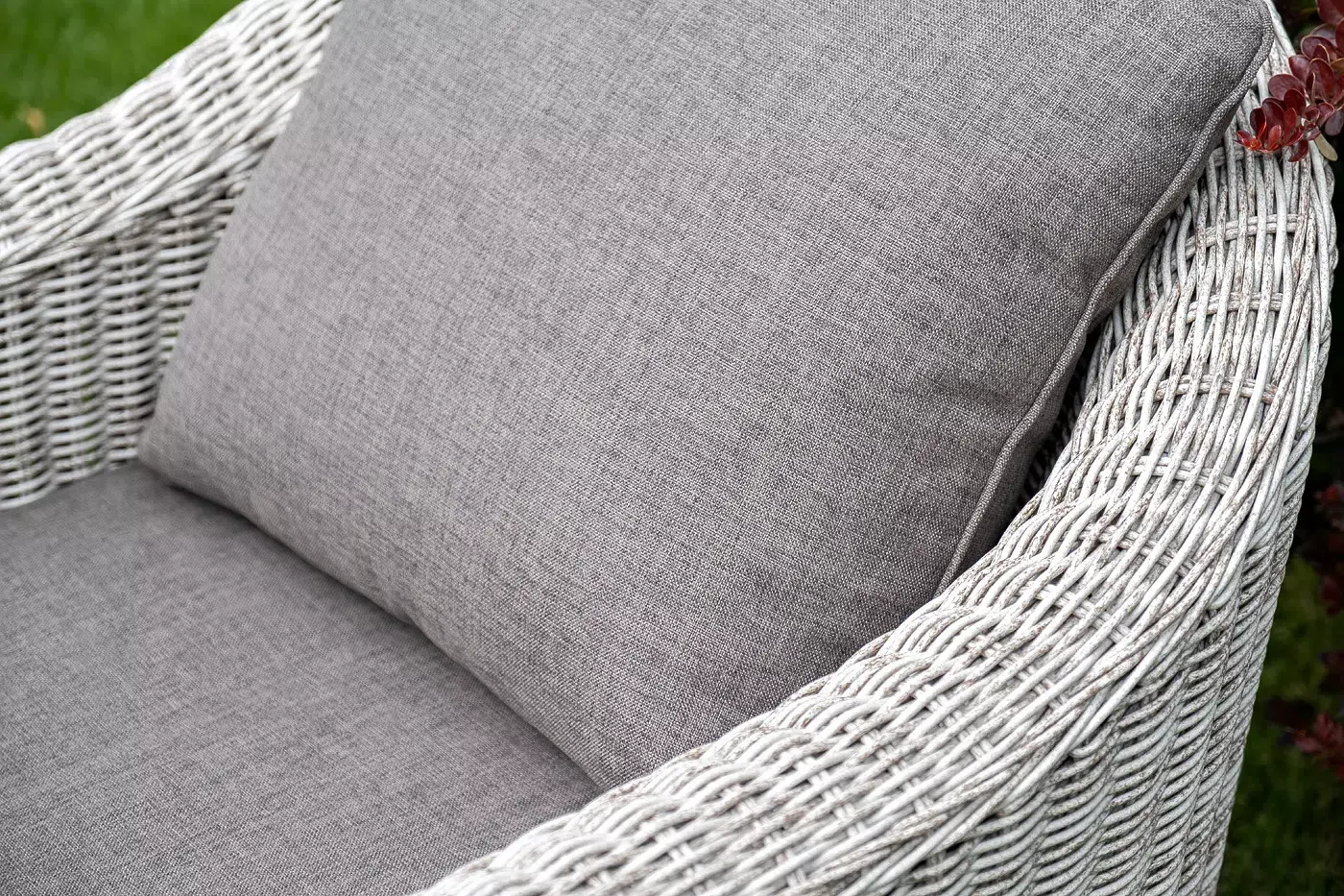 Садовая мебель выполнена из алюминиевого каркаса, выдерживающего большие нагрузки, и круглого искусственного ротанга. Каркас оплетен с помощью ручного метода и представлен в бежевом цвете.
