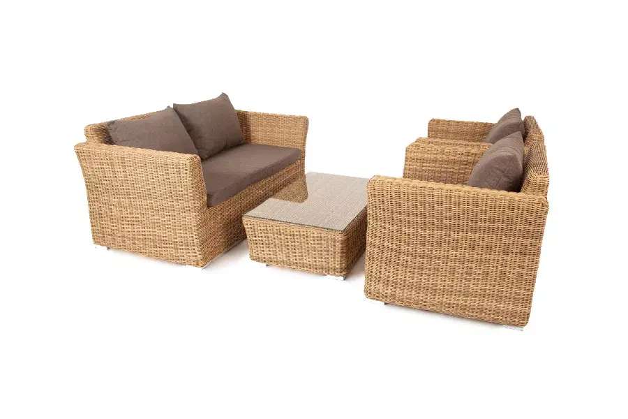 Прочный алюминиевый каркас усиливает устойчивость мебели. Его дополняет соломенная оплетка, которая представлена из круглого искусственного ротанга.