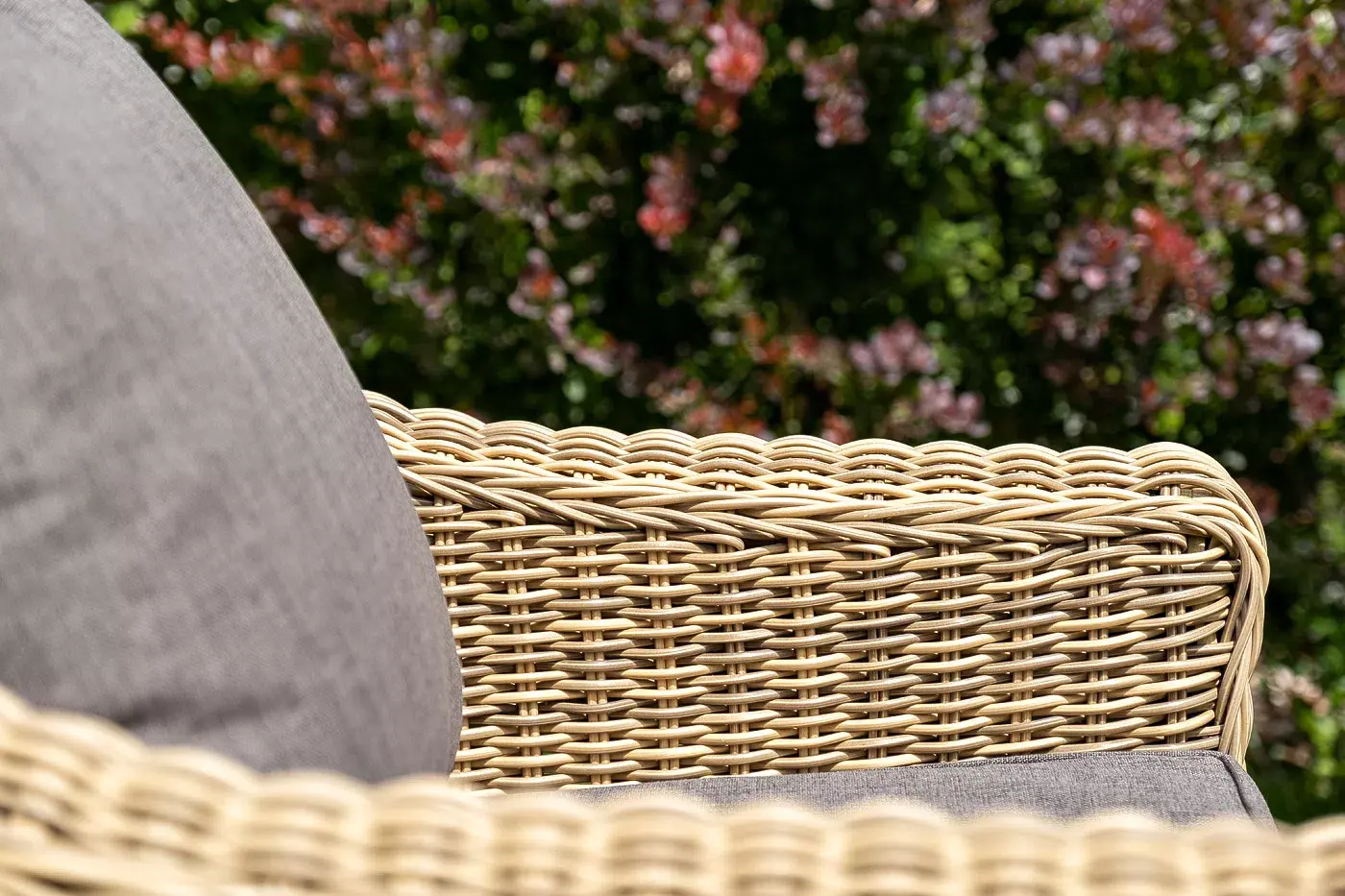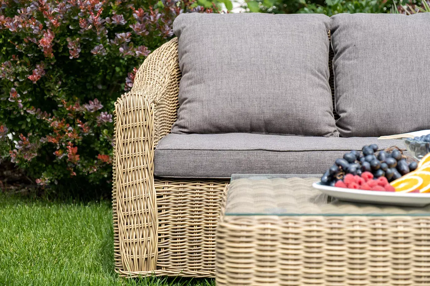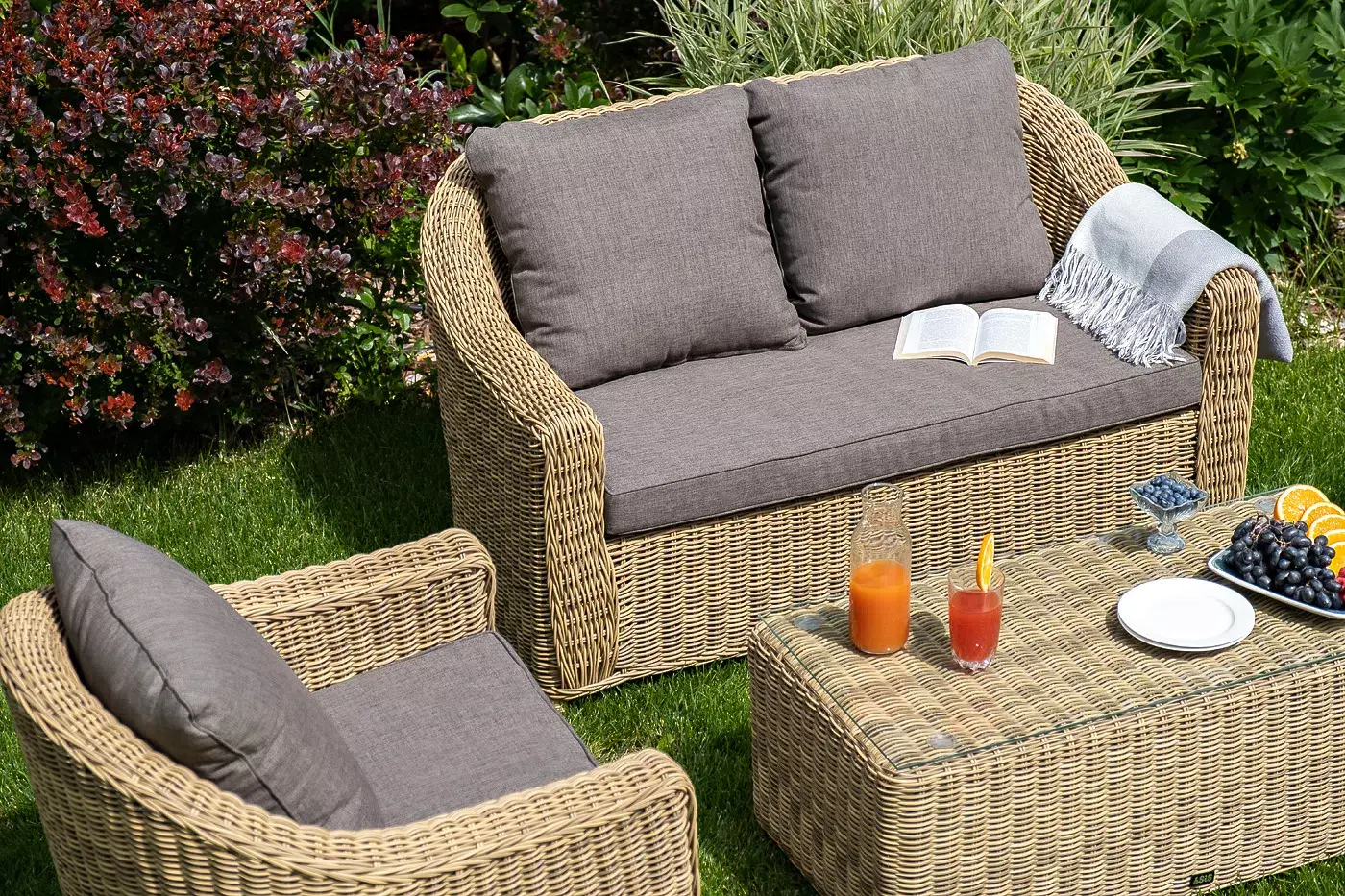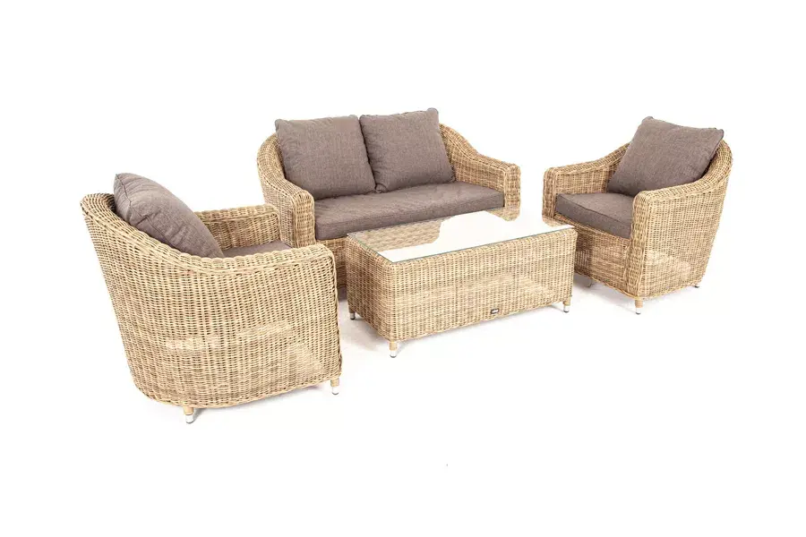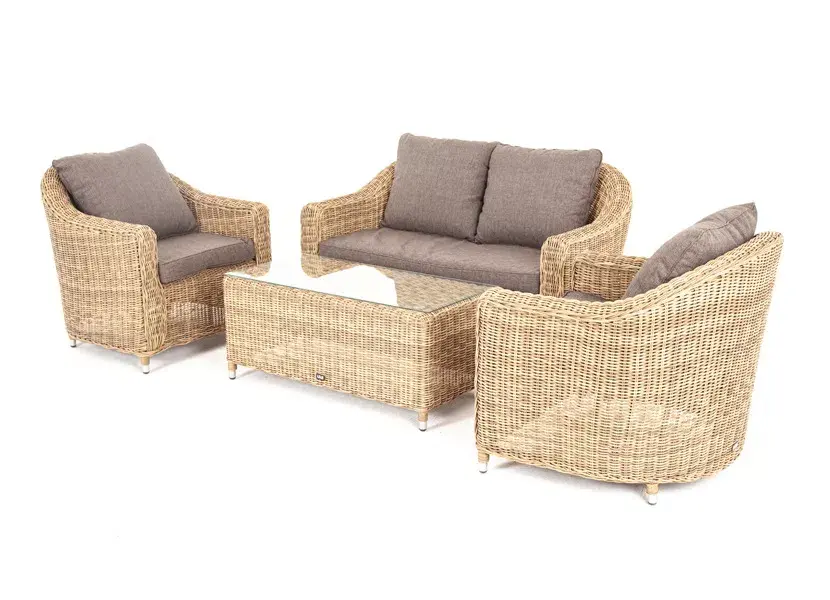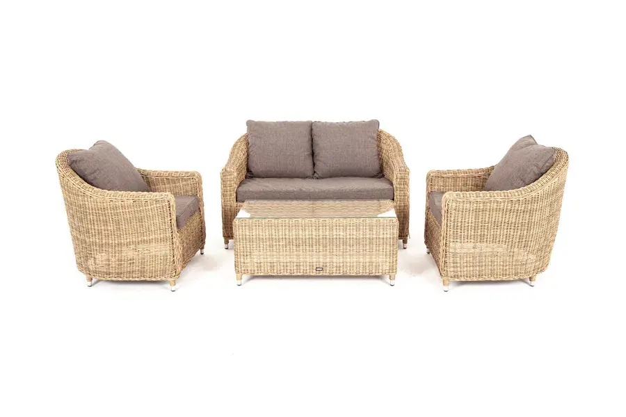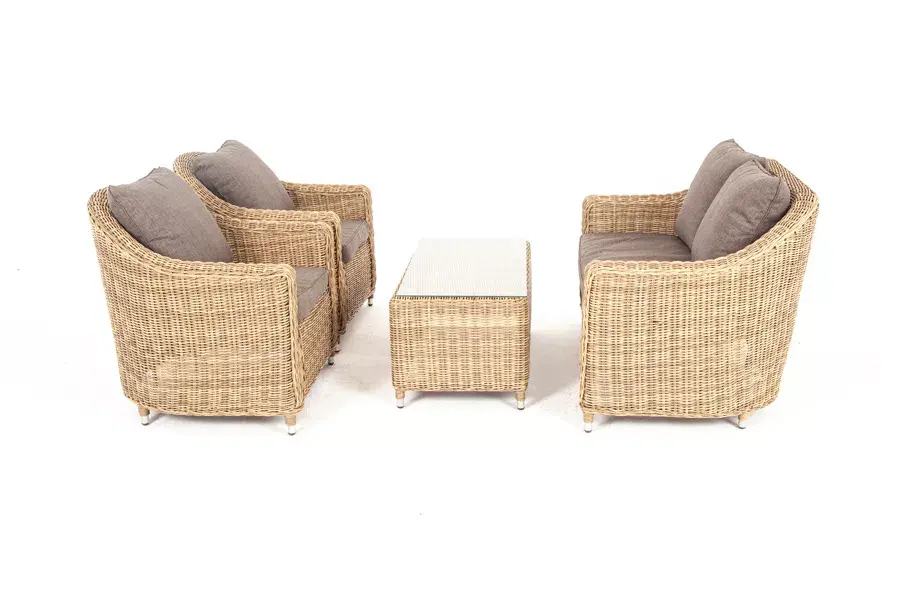 В основе мебели - алюминиевый каркас и круглый искусственный ротанг. Каркас оплетен с помощью ручного метода и представлен в соломенном цвете.