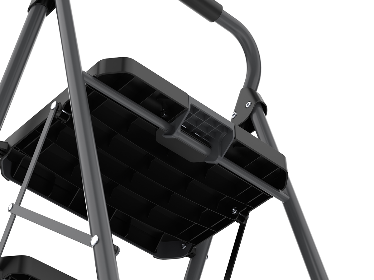 - У стремянки удобные широкие ступеньки с нескользящим и устойчивым к царапинам полипропиленовым покрытием. На них можно не только уверенно стоять, но и поставить банку с краской или положить инструменты.