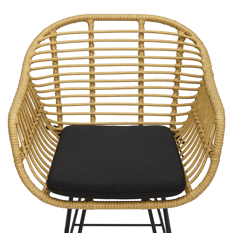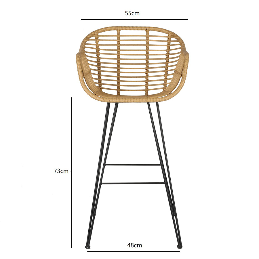 Материал: искусственный ротанг, сталь, полиэстер, пенополиуретан. Высота сиденья: 72 см. Ширина сиденья: 38 см. Глубина сиденья: 35 см. Высота спинки: 35 см. Ширина спинки: 49 см. Высота подлокотников: 20 см. Высота подножки: 32 см. Высота подушки: 4 см. Максимальная нагрузка: 135 кг.