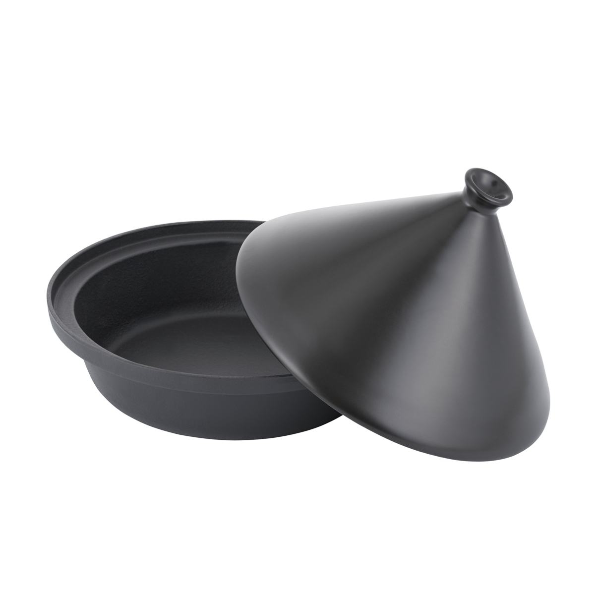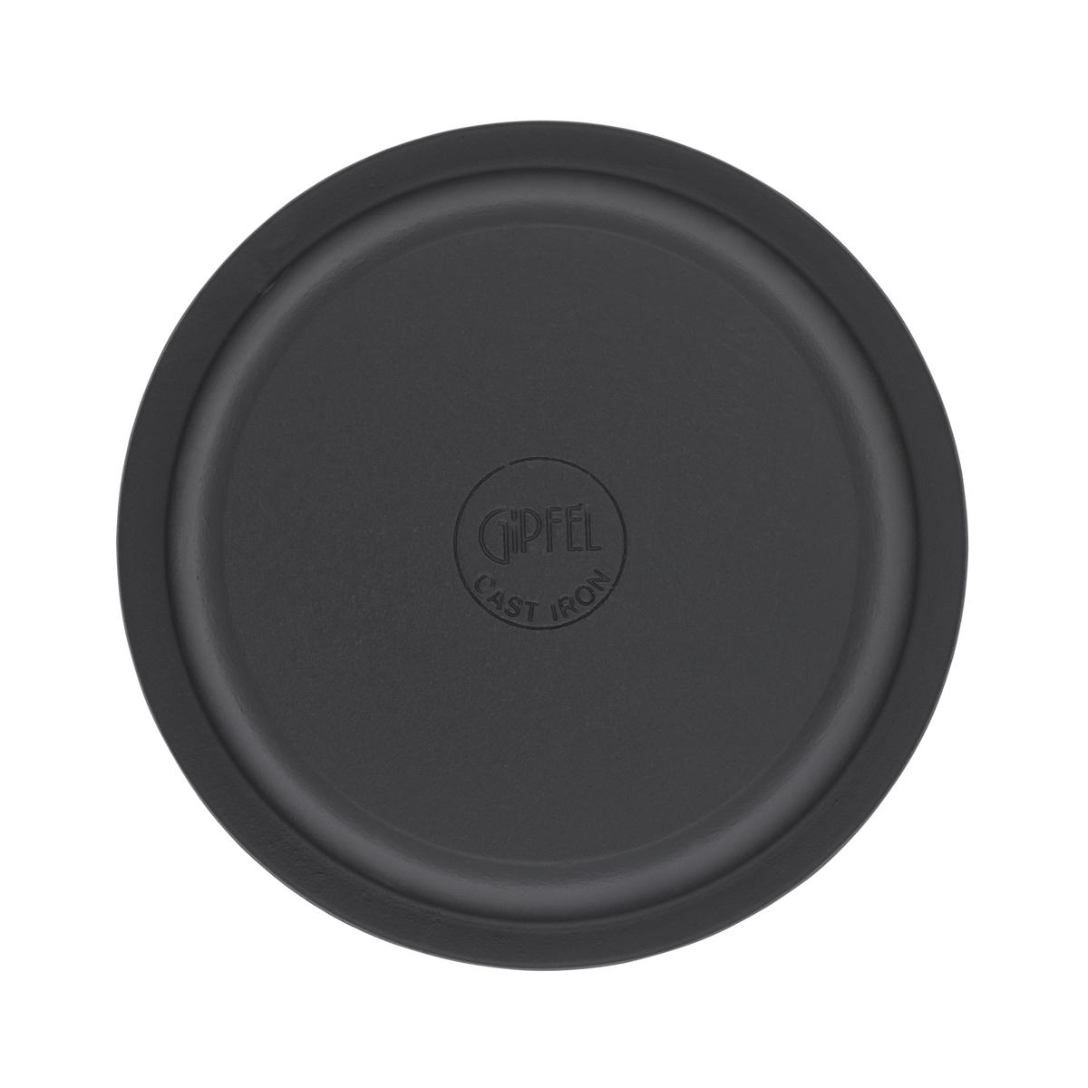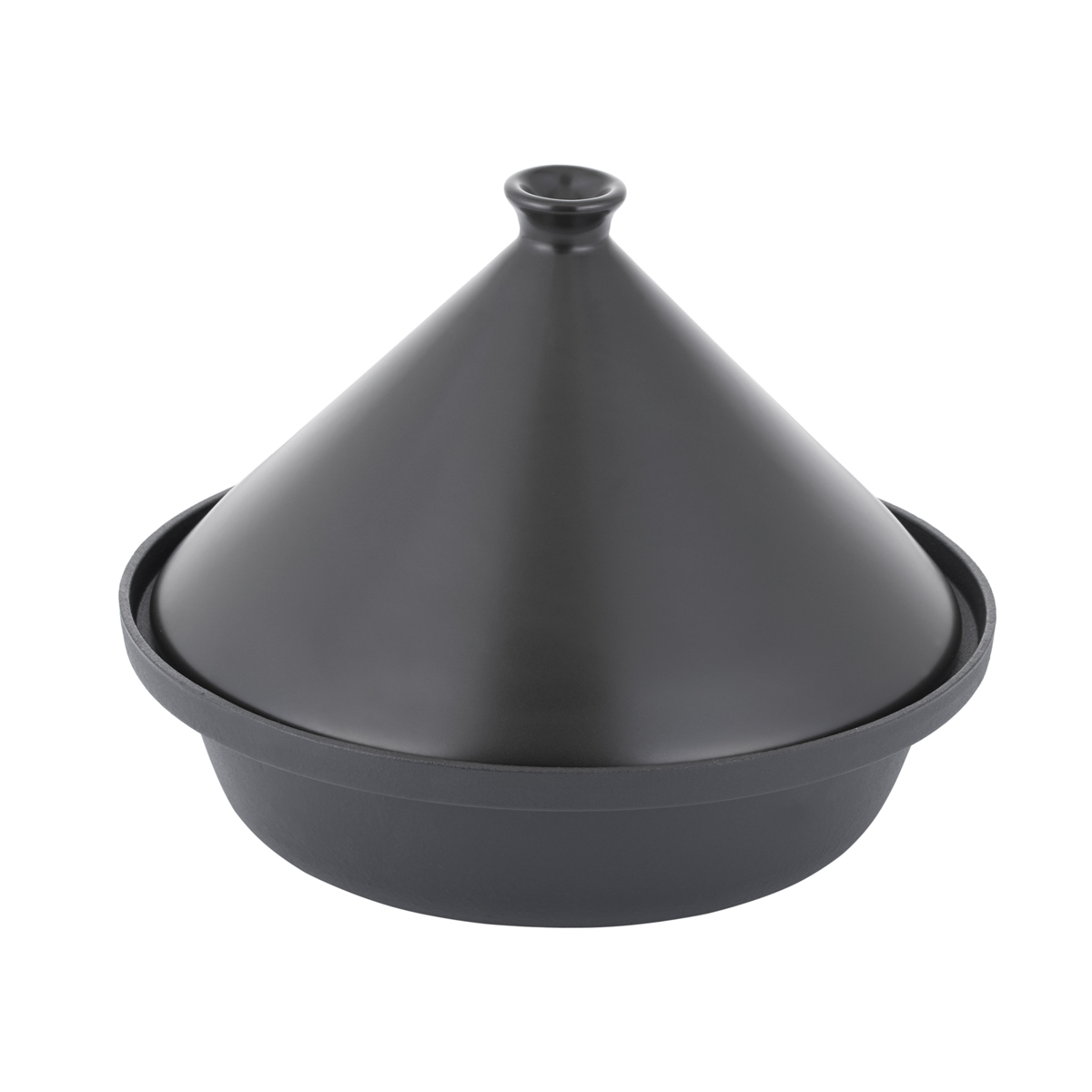 Таджин чугунный с керамической крышкой Gipfel 50649. Таджин сделан из чугуна с эмалированным покрытием внутри. Диаметр составляет 30 см. Таджин и крышка черного цвета.