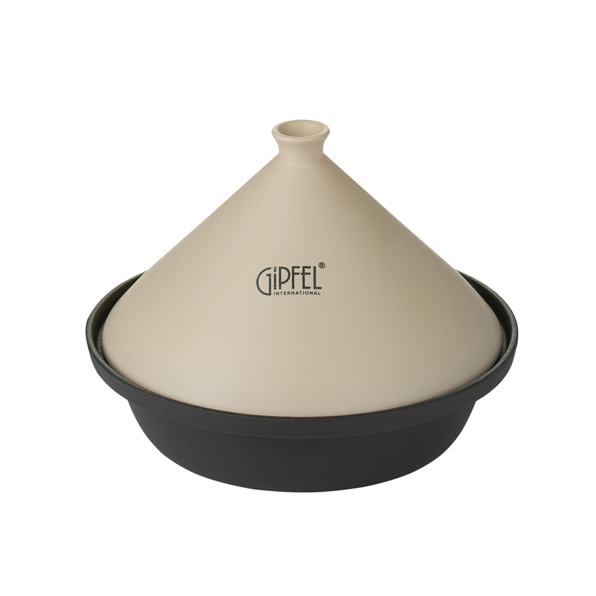 Таджин Gipfel AMEY 3818. Таджин сделан из чугуна, покрытого эмалью. Крышка бежевого цвета выполнена из высокотемпературной керамики, она цельная, без отверстия для выхода пара. Диаметр 30 см.