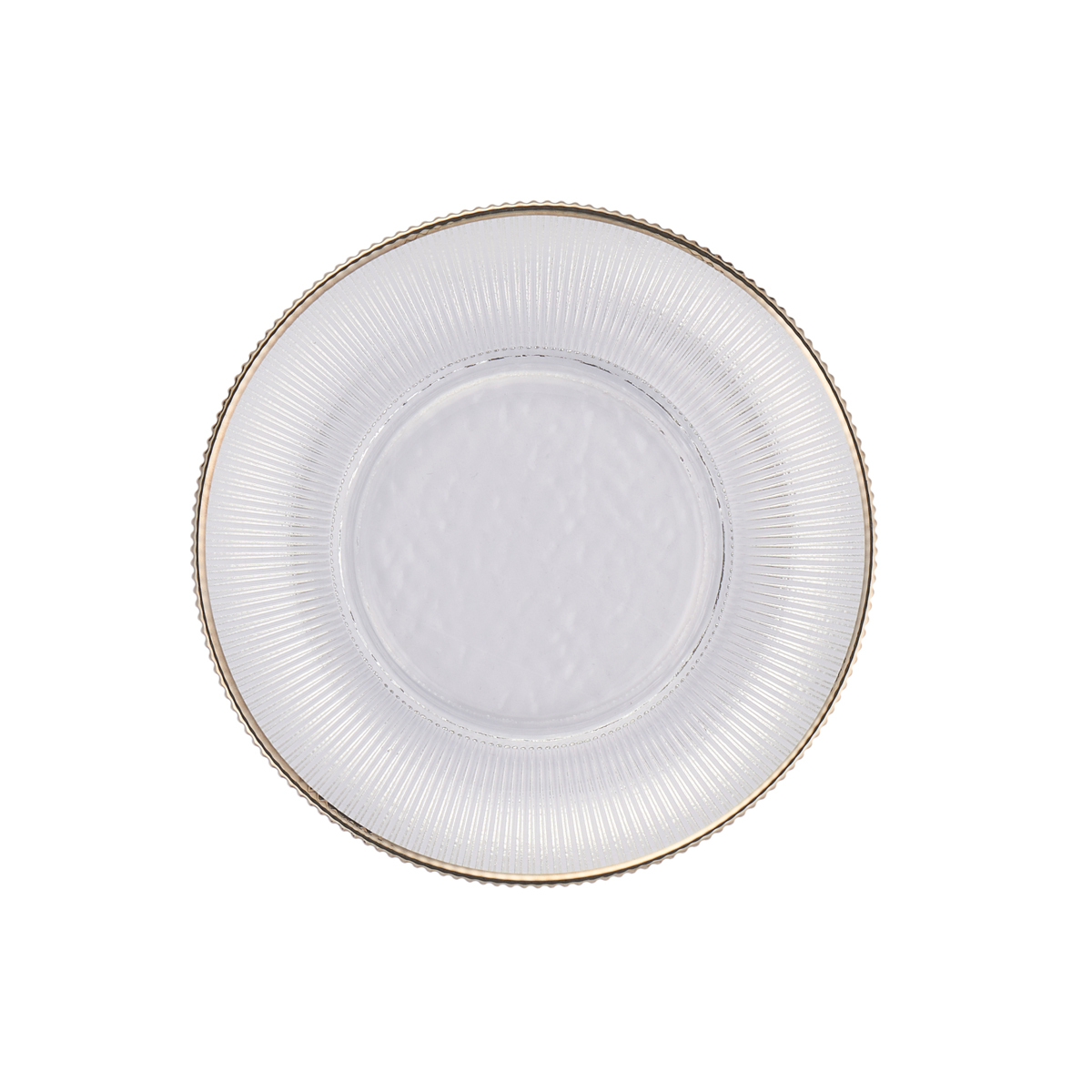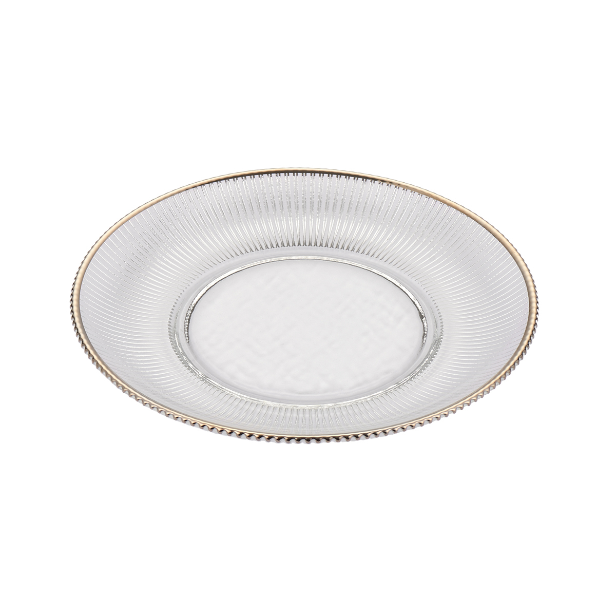 Тарелка Gipfel Sensi 40874 диаметром 21 см. Тарелка прозрачная, с золотым ободом по краю, снаружи имеет рельефный рисунок в виде расходящихся лучей. Тарелки серии Sensi представлены в разных размерах, из них вы можете собрать целый набор в едином стиле.
