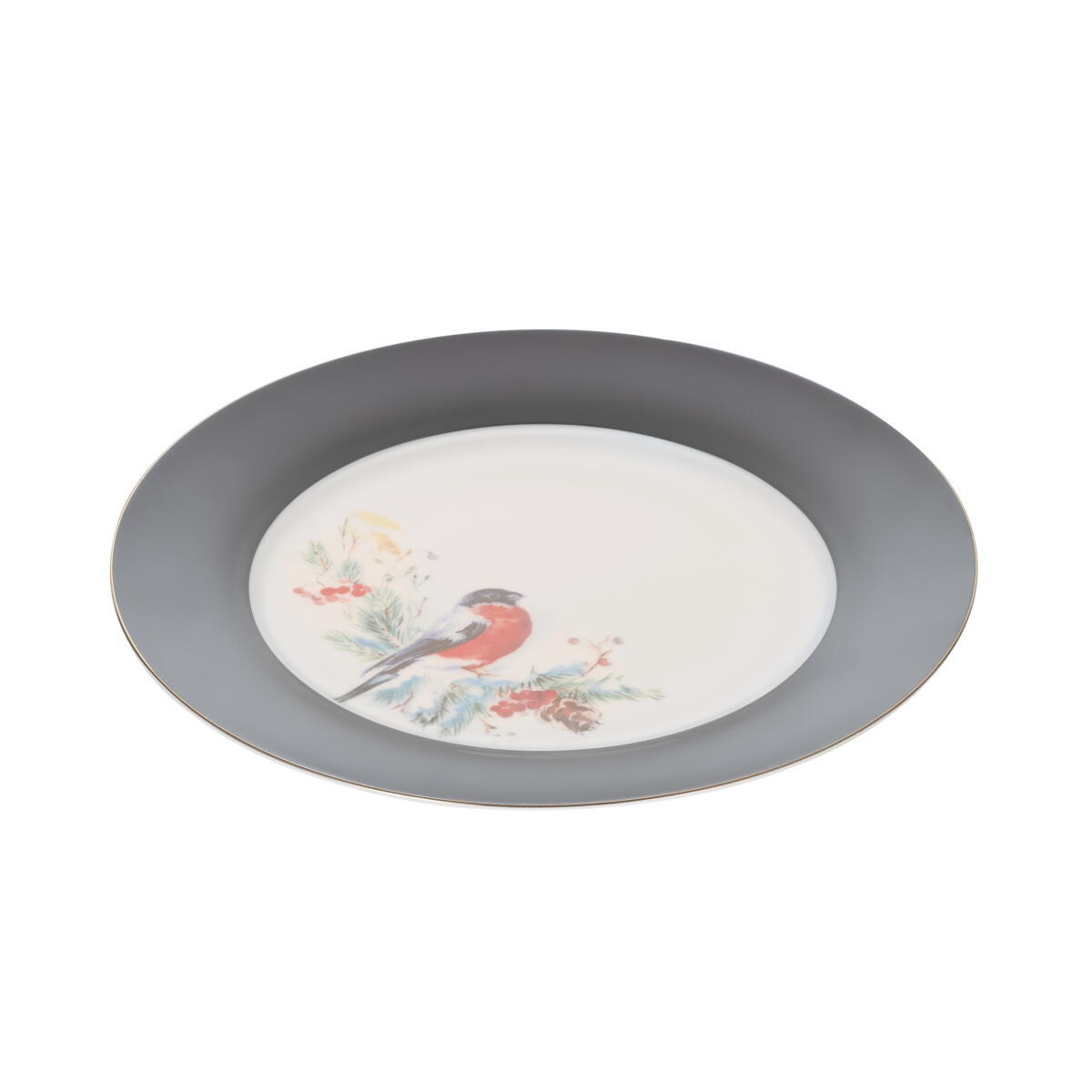 Тарелка обеденная Gipfel CHRISTMAS FORREST 41249. Размер 26,5 см. Тарелка сделана из белого костяного фарфора с серой каймой и рисунком снегиря на еловой ветке. Такие тарелки непременно станут изюминкой праздничной сервировки к зимним праздникам.