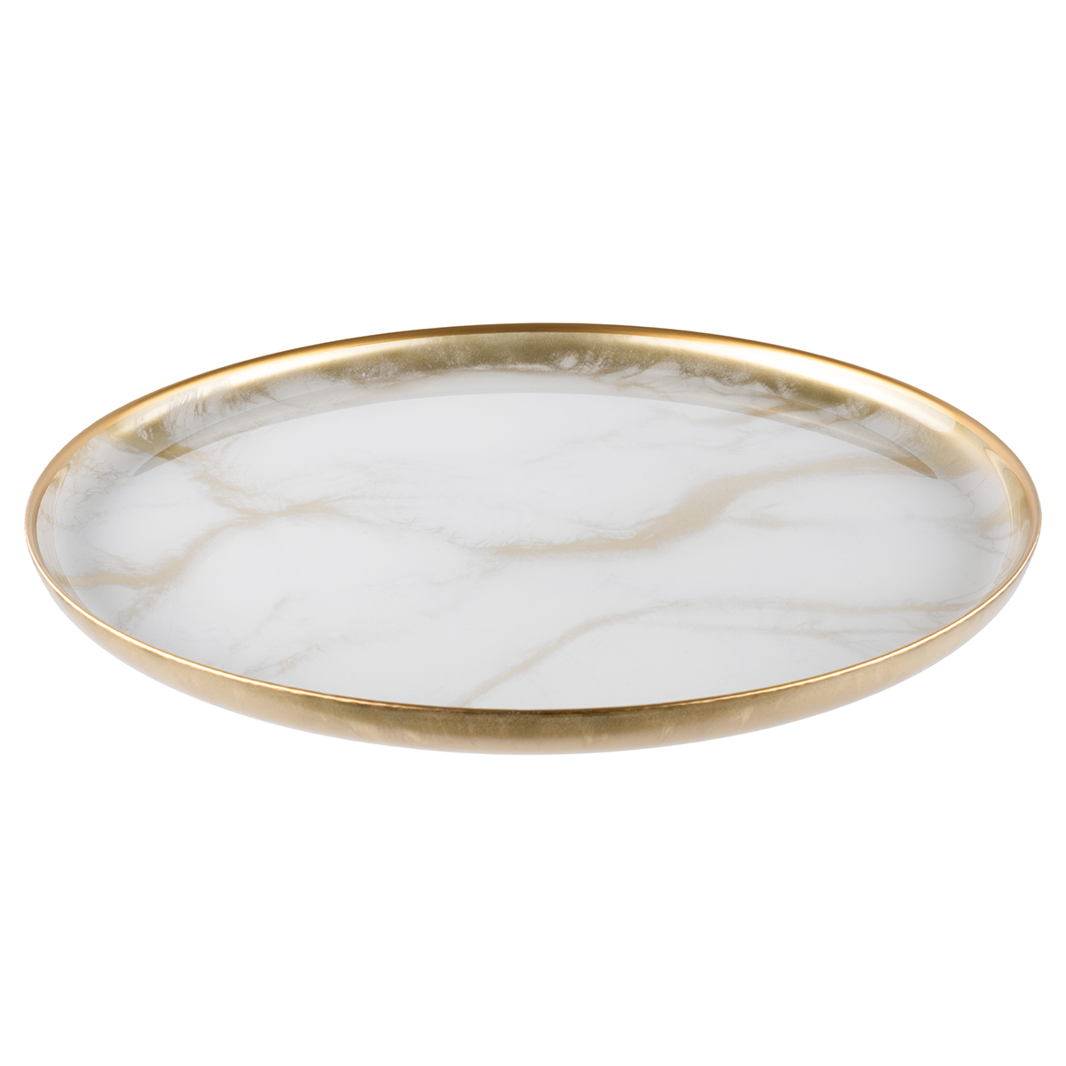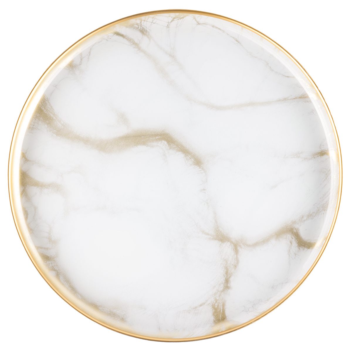 Тарелка выполнена в элегантном снежно-белом оттенке с золотистыми прожилками как из драгоценного мрамора.