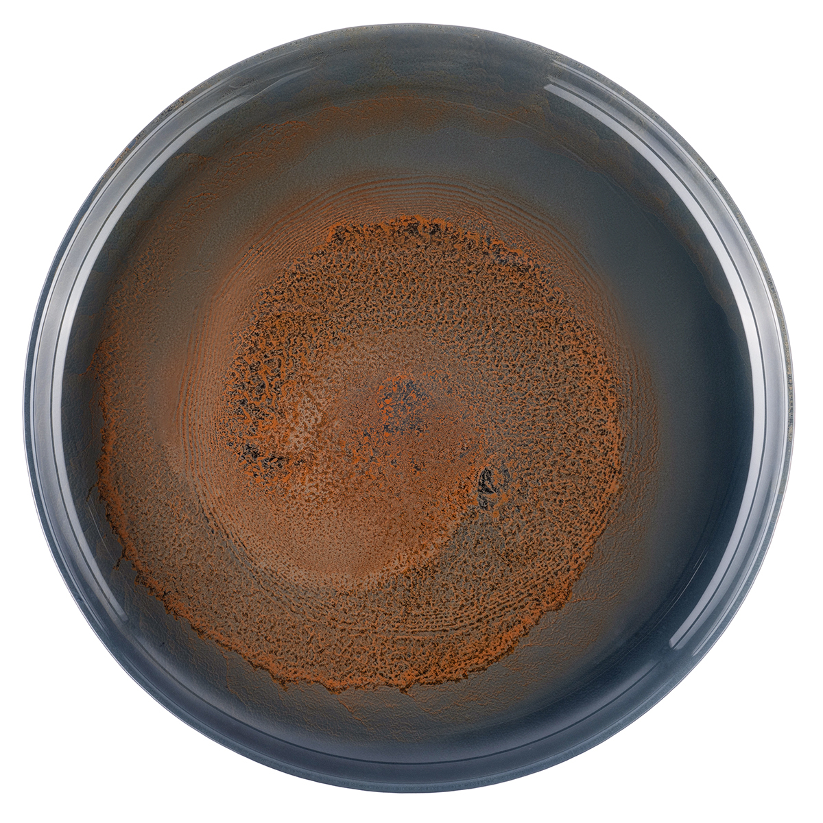 Тарелка выполнена с глянцевой поверхностью в удивительной палитре цветов: от изумрудно-зеленого, переходящего в янтарный, медовый и коричневые оттенки, дополненных акцентами синего, от нежно-голубых до индиго.