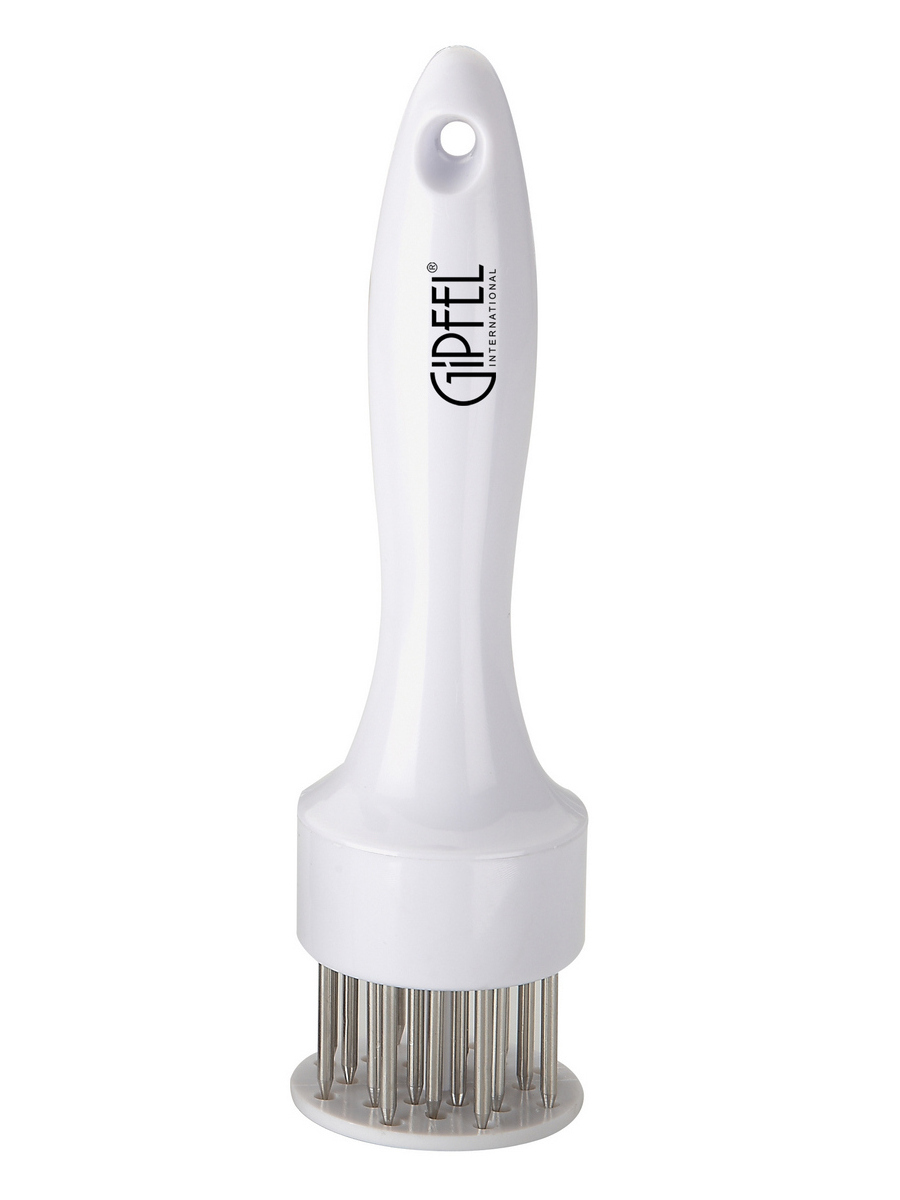 Тендерайзер Gipfel 6280. Высота 19 см, диаметр рабочей части 5 см. Подойдет для отбивания любого мяса, что позволит сделать его нежным и сочным с результате запекания. Ручка выполнена из пластика белого цвета, имеет петлю для подвешивания. Зубчики сделаны из хирургической стали 18/10.