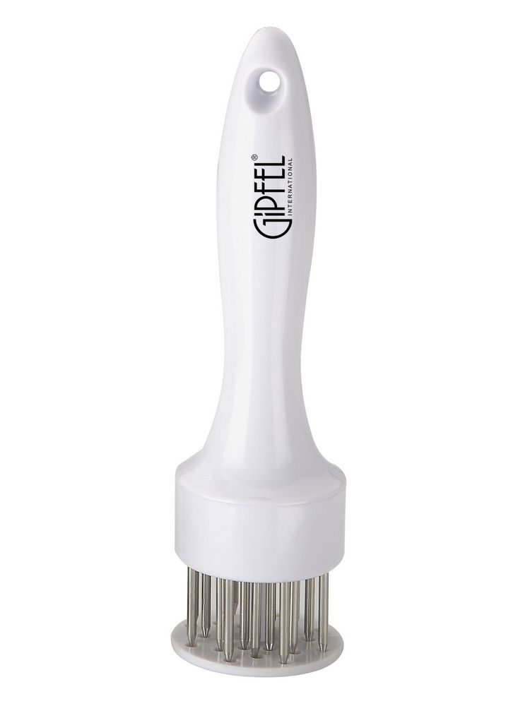 Тендерайзер GIPFEL 6280. Высота 19см, диаметр рабочей части 5см. Подойдет для отбивания любого мяса, что позволит сделать его нежным и сочным с результате запекания. Ручка выполнена из пластика белого цвета, имеет петлю для подвешивания. Зубчики сделаны из хирургической стали 18/10.
